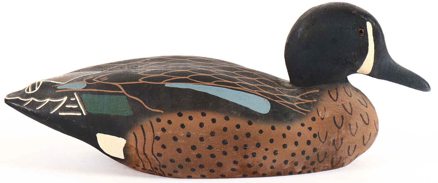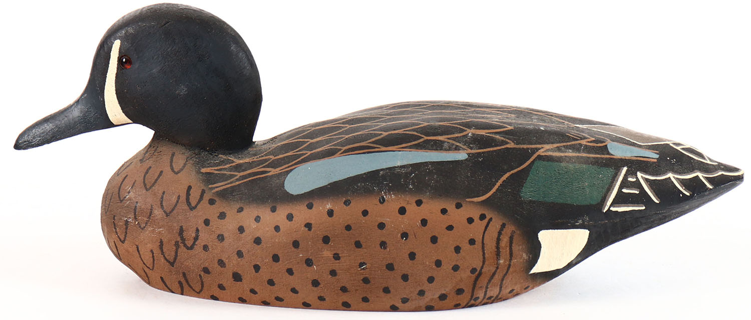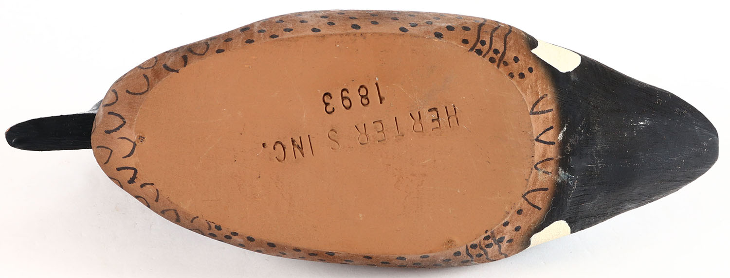 Blue Winged Teal Drake by Herters Decoy Co., Waseca, MN. 1893 series, glass eyes, solid wood, original paint, structurally excellent, branded on the bottom. Grade: Excellent ++ - Value: 50 to 100