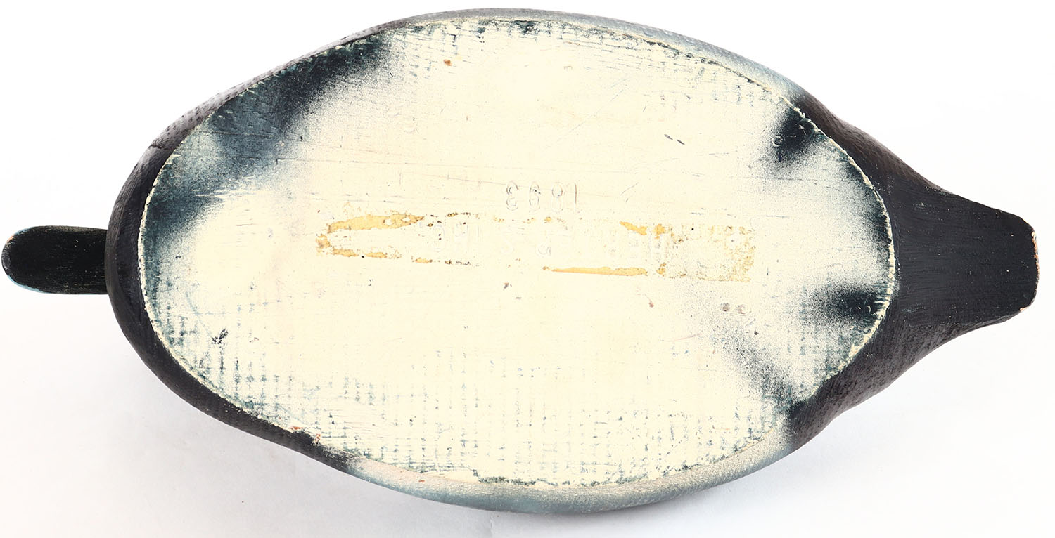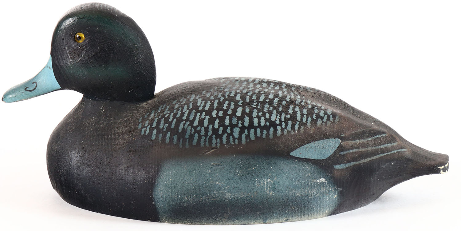 Bluebill Drake by Herters Decoy Co., Waseca, MN, 1893 series, glass eyes, solid wood, original paint, structurally excellent, branded on bottom. Grade: Excellent - Value: 50 to 100