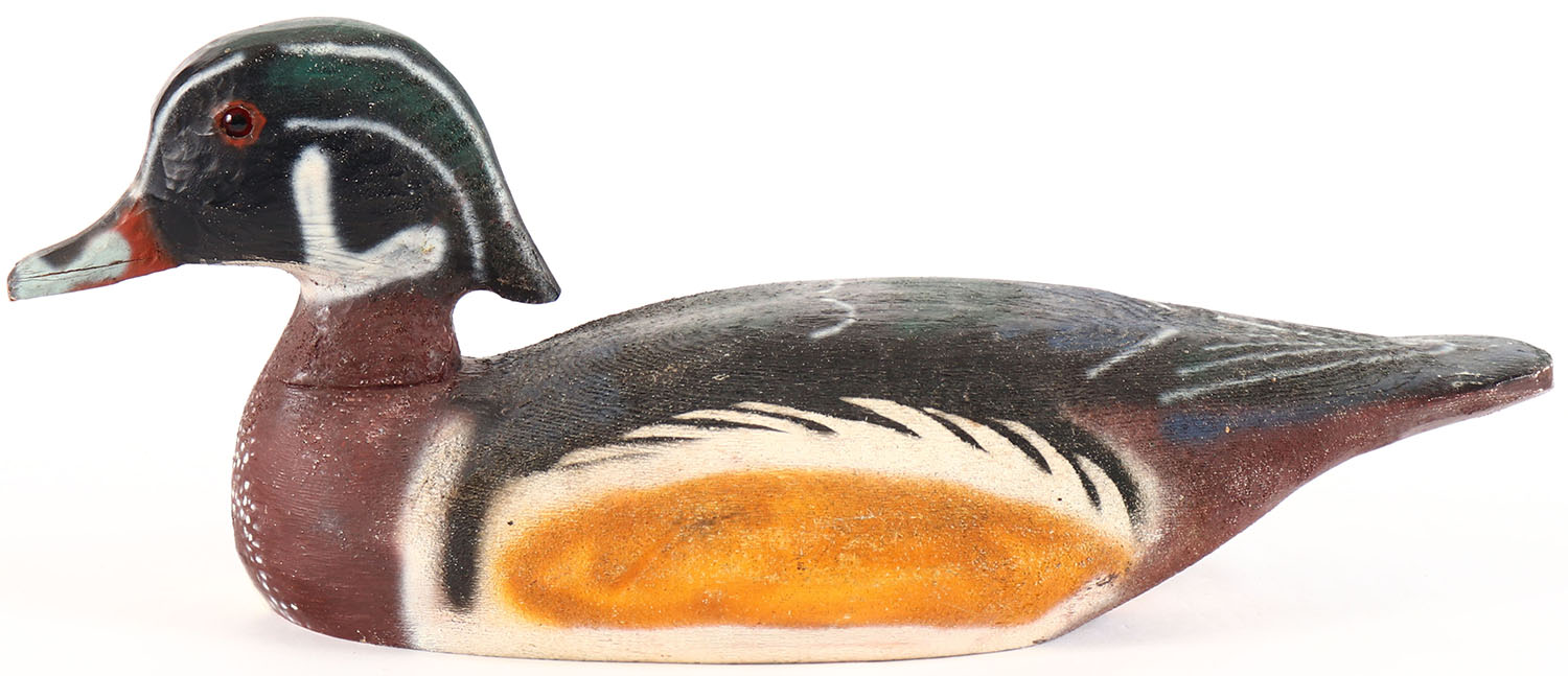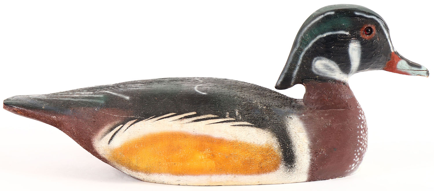 Woodduck Drake by Herters Decoy Co., Waseca, MN, 1893 series, glass eyes, solid wood, original paint, structurally excellent, unbranded. Grade: Excellent - Value: 50 to 100