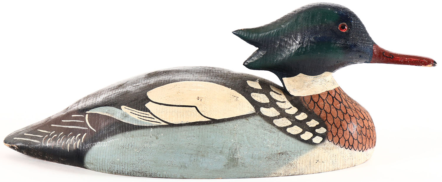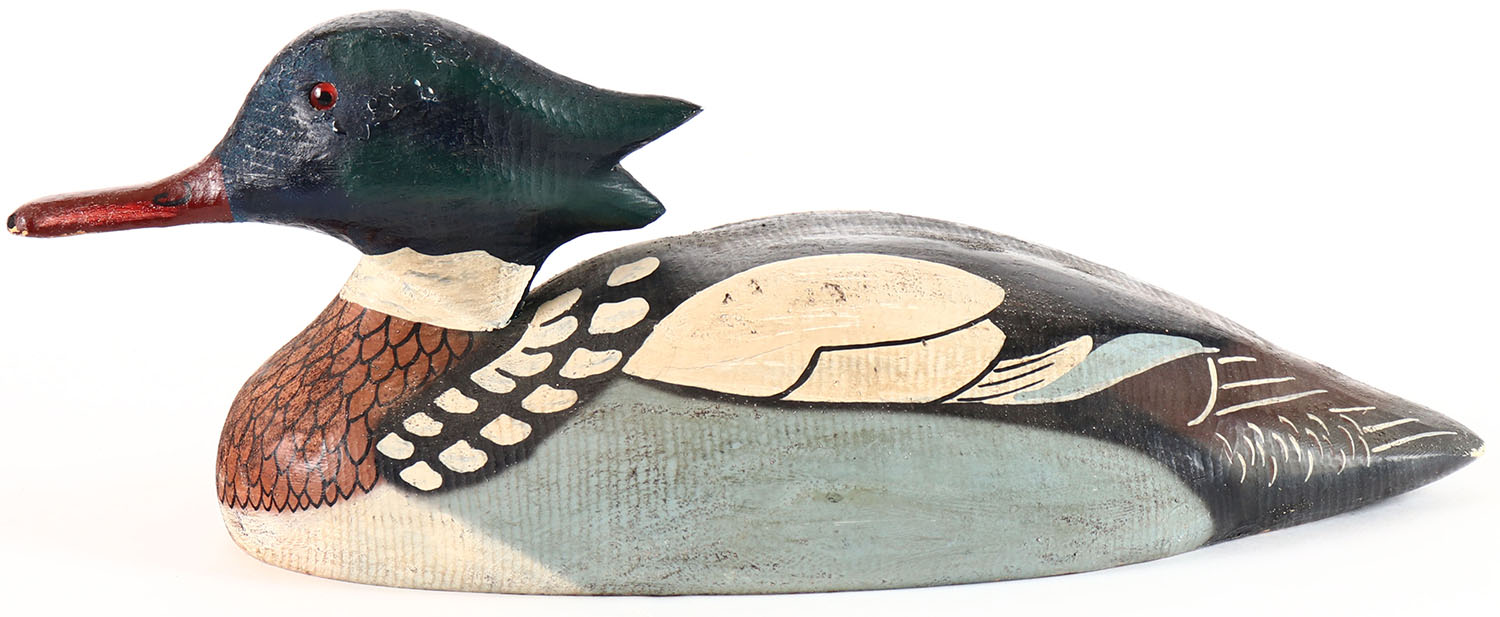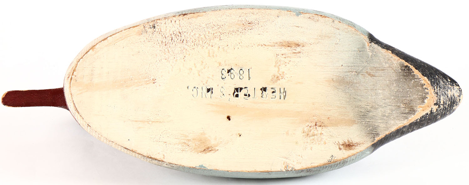 Red Breasted Merganser by Herters Decoy Co., Waseca, MN, 1893 series, glass eyes, solid wood, original paint with light soiling, structurally excellent, branded on bottom. Grade: Excellent - Value: 50 to 100