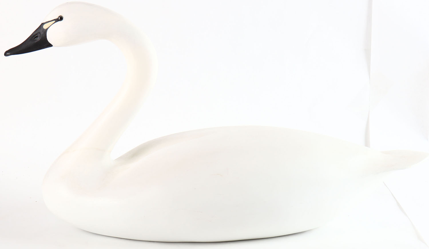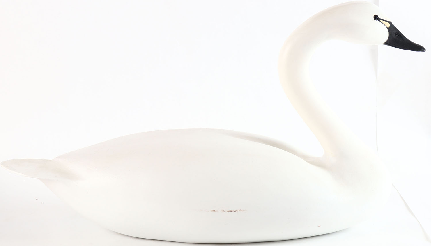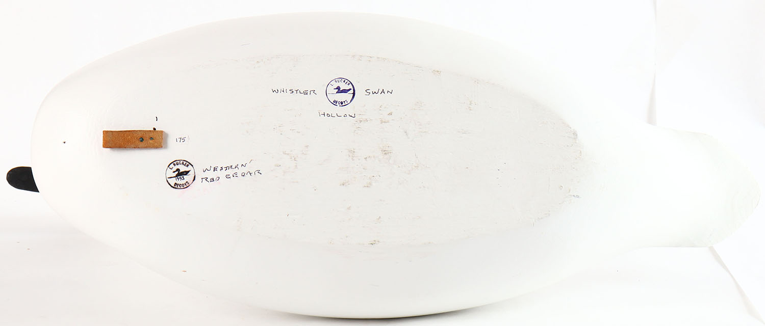 Swan by Larry Rucker, Maple Valley, WA, glass eyes, hollow red cedar wood, body length 27 inches long, mini original paint, maker stamp on bottom. Grade: Excellent - Value: 200 to 400