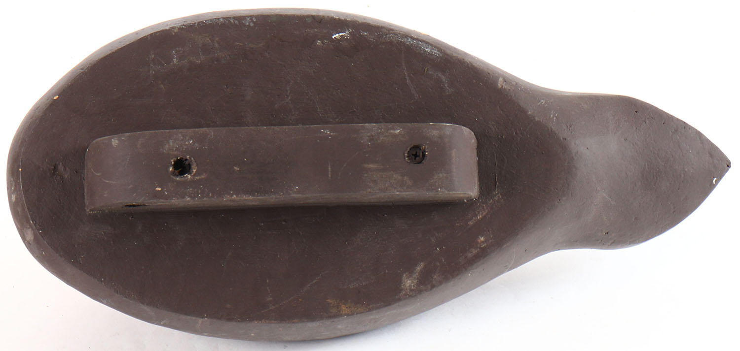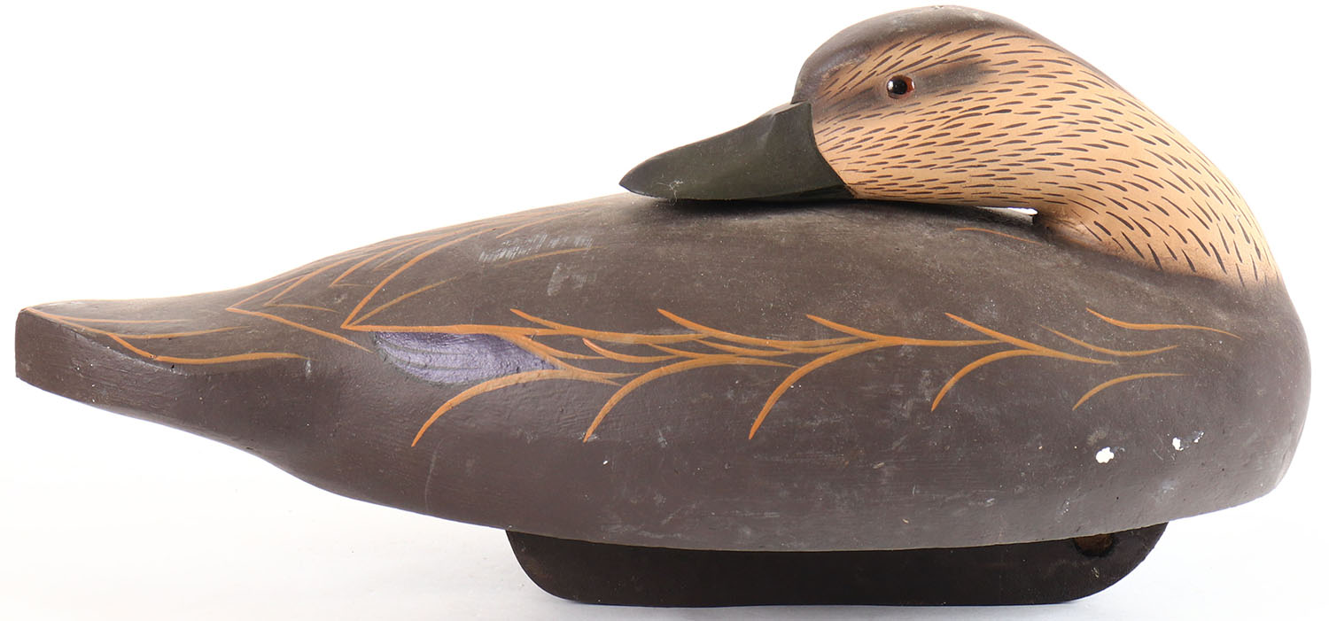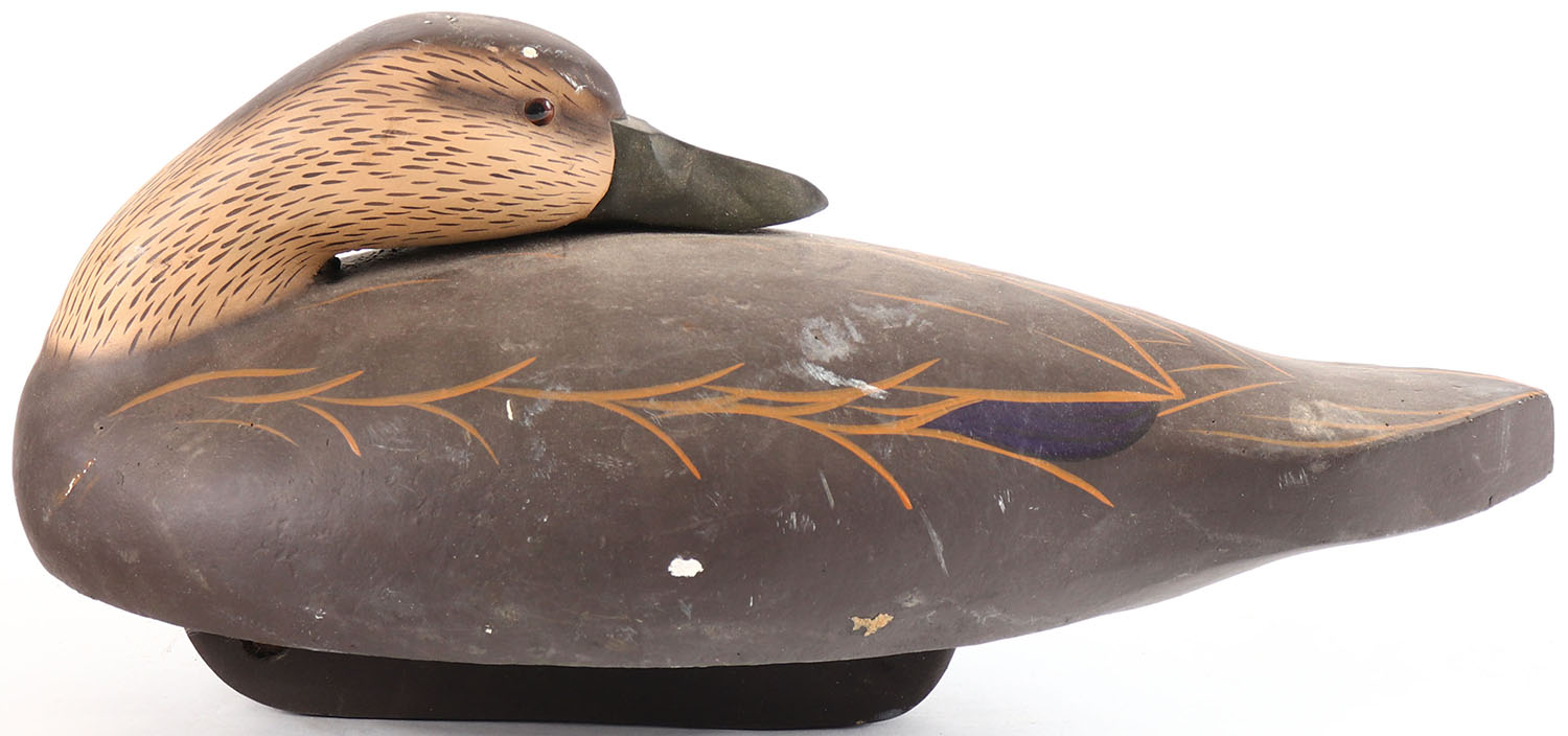 Preening Black Duck by unknown maker, glass eyes, solid wood, original paint with some surface scars, structurally excellent. Grade: Excellent - Value: 30 to 60