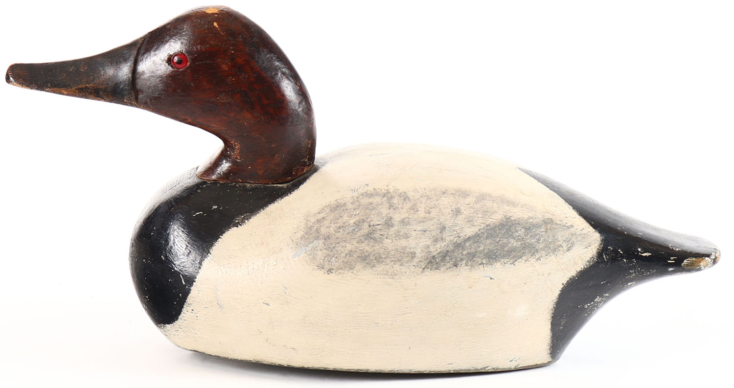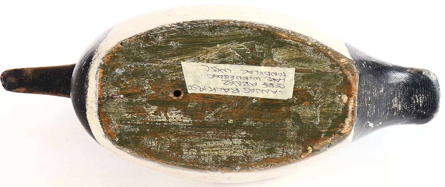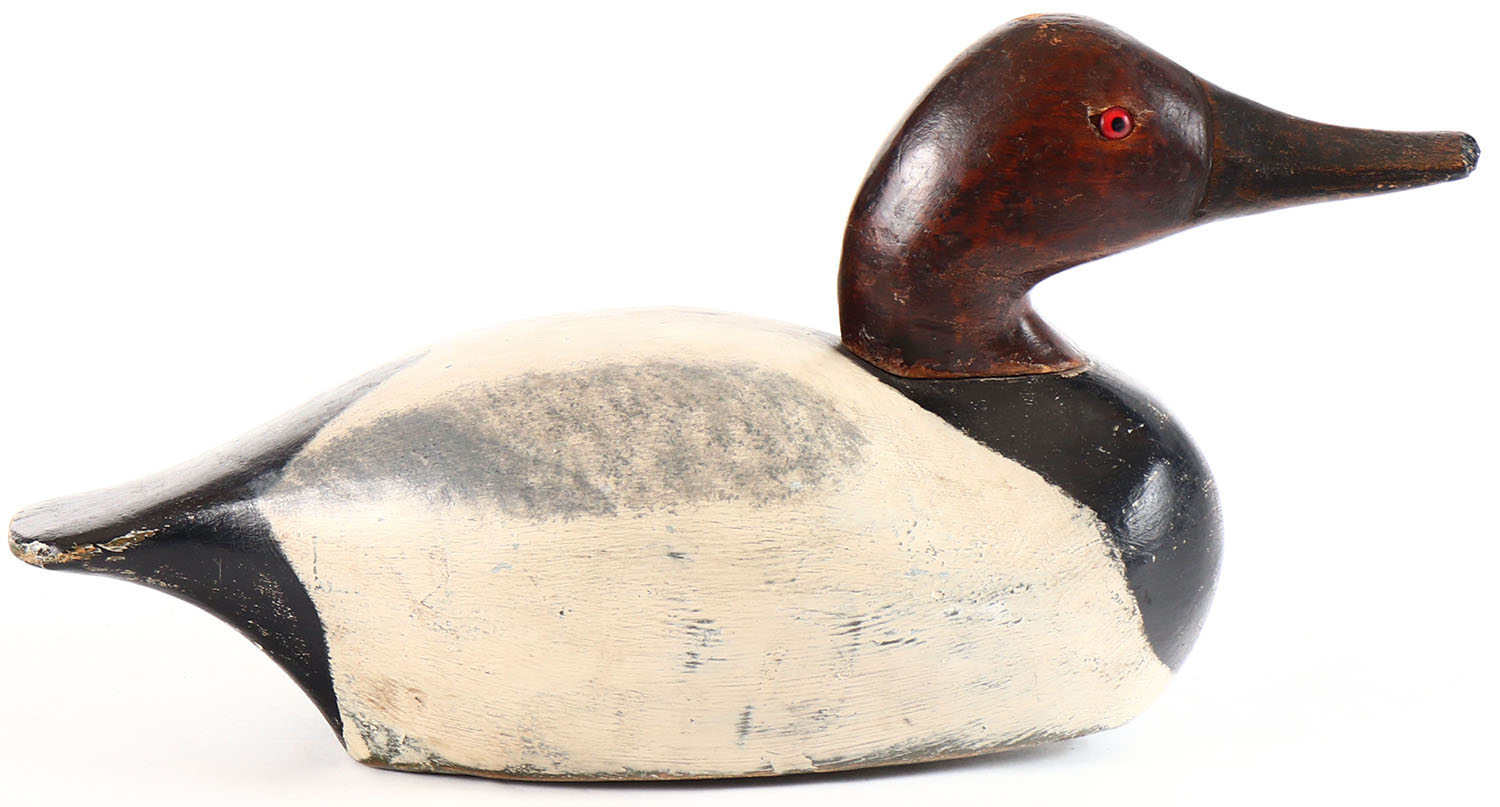 Canvasback Drake attributed to Serph Arenz, WI, glass eyes, solid wood, repainted, structurally excellent. Grade: Very Good ++ - Value: 30 to 60