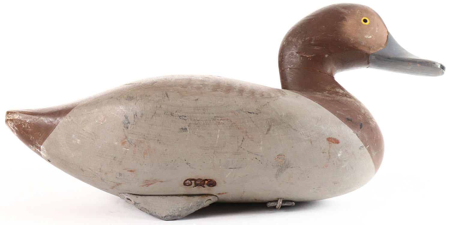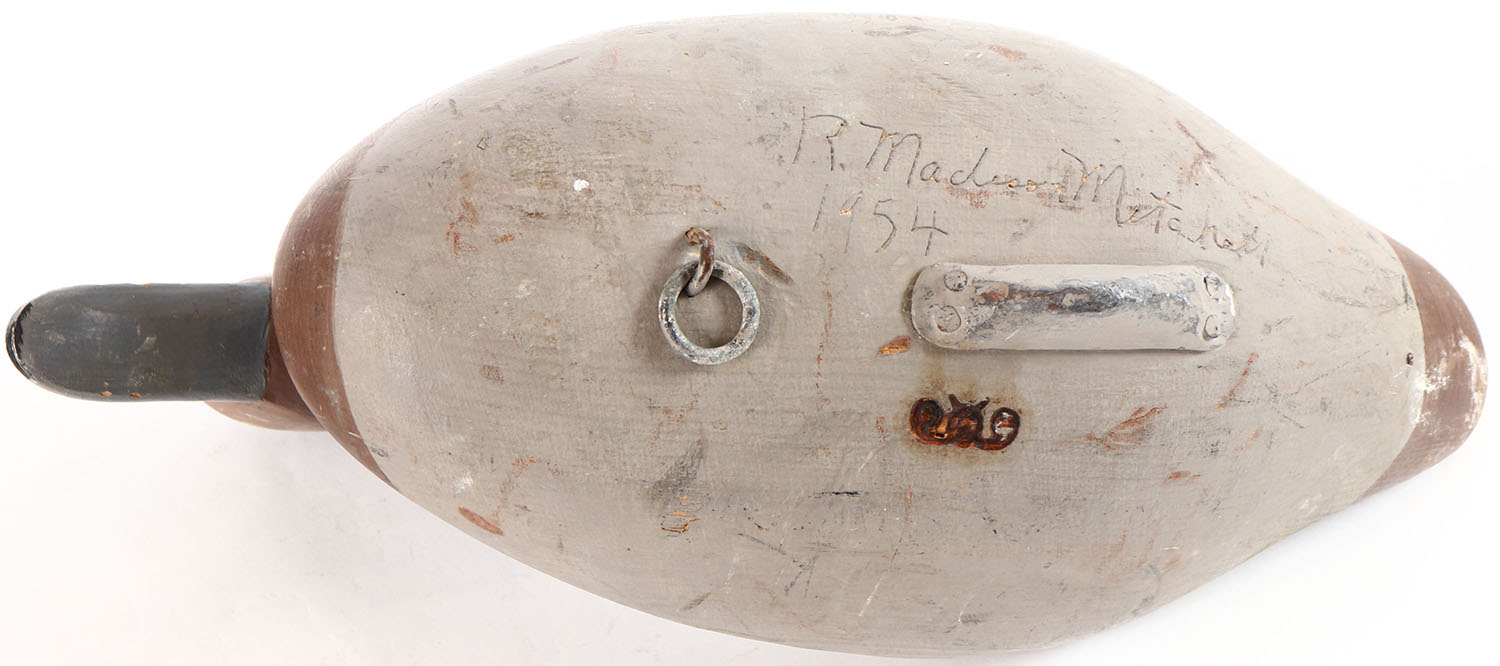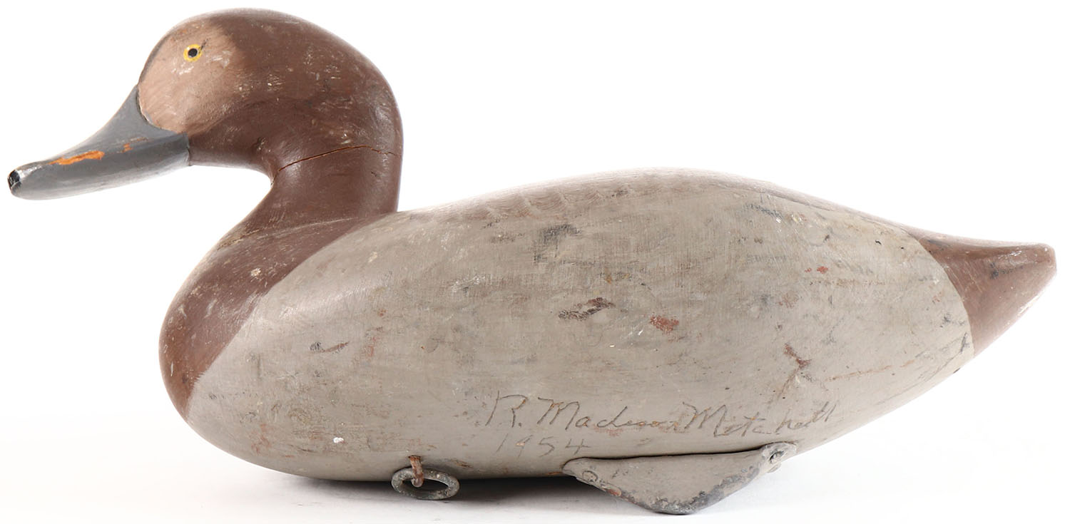 Bluebill Hen by Madison Mitchell, painted eyes, solid wood, original paint, has age crack around neck. Grade: Very Good + - Value: 70 to 150