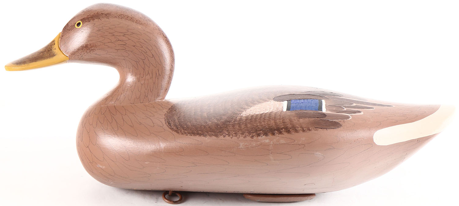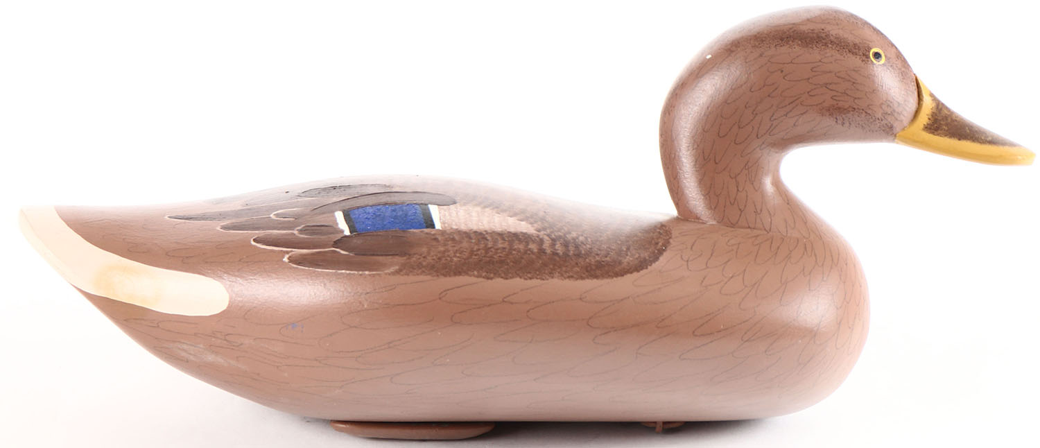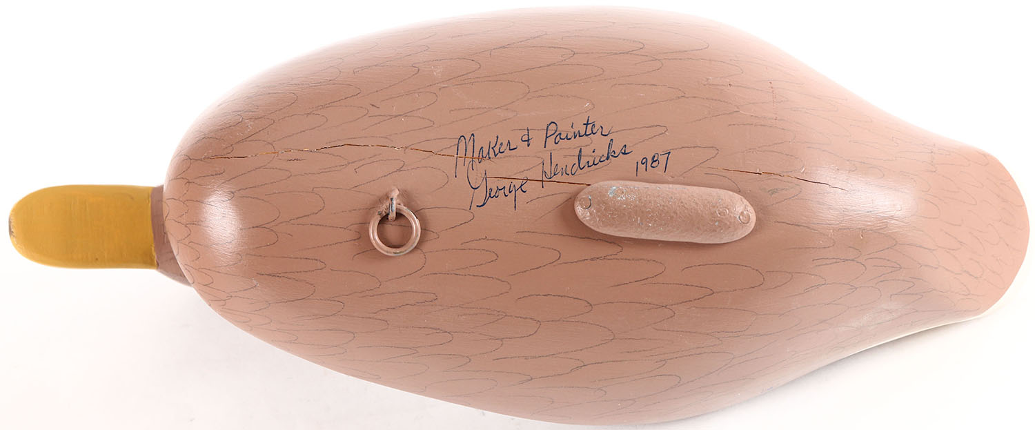 Mallard Hen by George Hendricks, painted eyes, solid wood, original paint, has age cracks on bottom. Grade: Very Good + - Value: 20 to 40