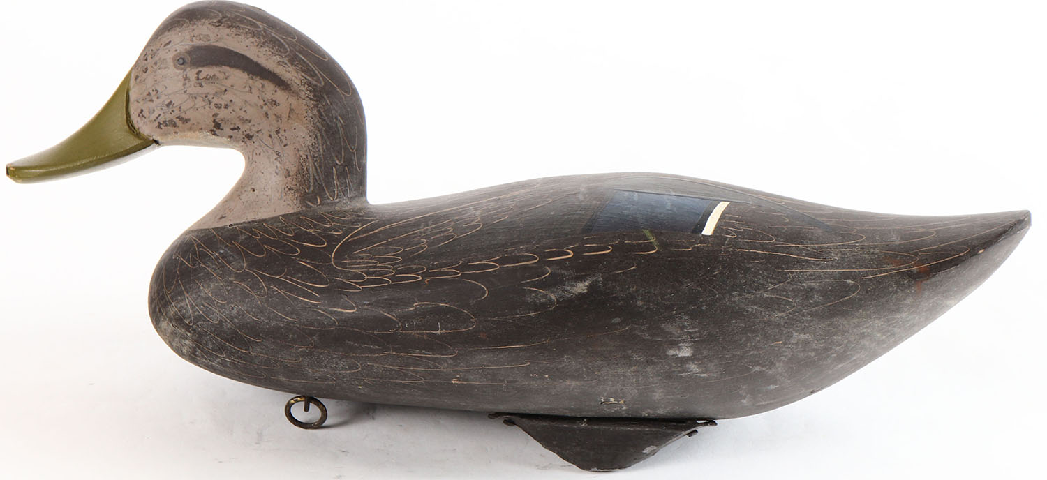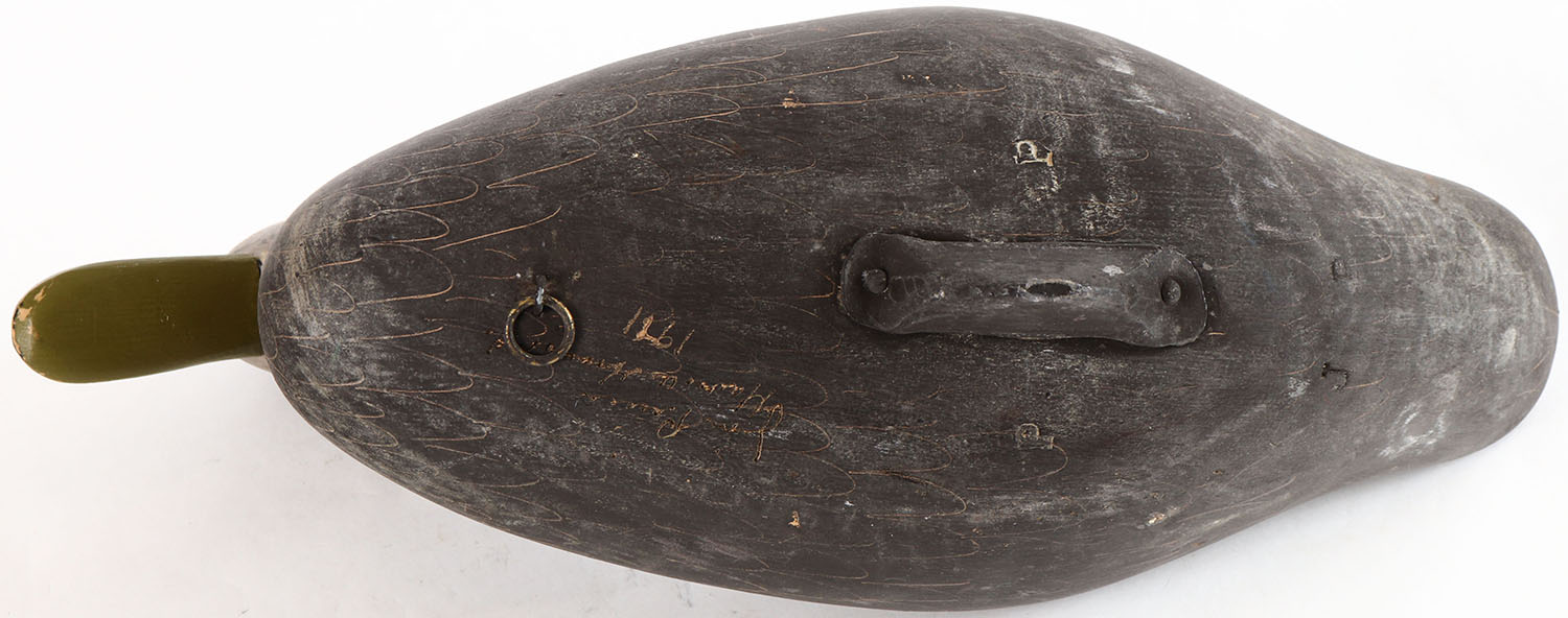 Black Duck by Jim Pierce & Son Decoys, Havre De Grace MD, painted eyes, solid wood, structurally excellent, signed on bottom by JIM PIERCE. Grade: Excellent + - Value: 50 to 100