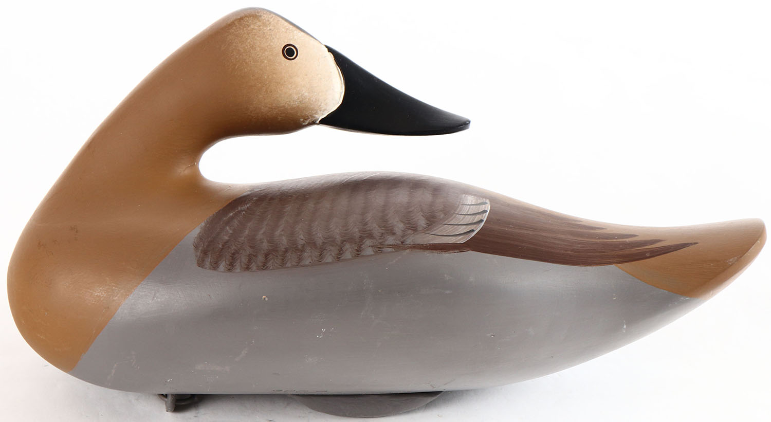 Preening Canvasback Hen by Charles Jobes, Havre de Grace, MD, painted eyes, solid wood, original paint, structurally excellent, signed on bottom by CHARLES JOBES. Grade: Excellent ++ - Value: 40 to 80