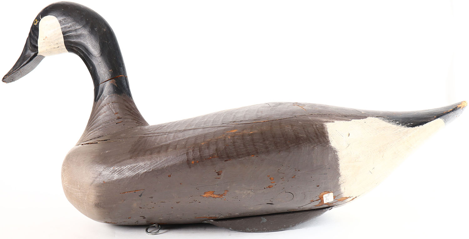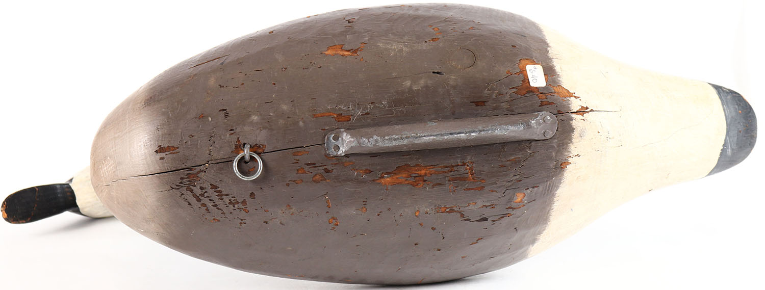 Canada Goose by unknown Maryland maker, painted eyes, solid wood, original paint with working wear, has age crack on back and around neck. Grade: Very Good - Value: 70 to 150