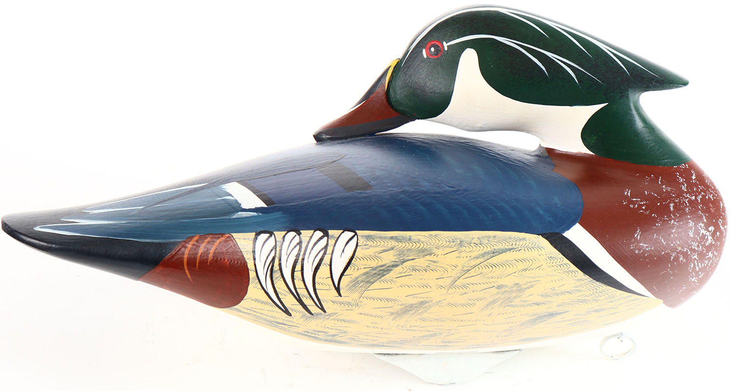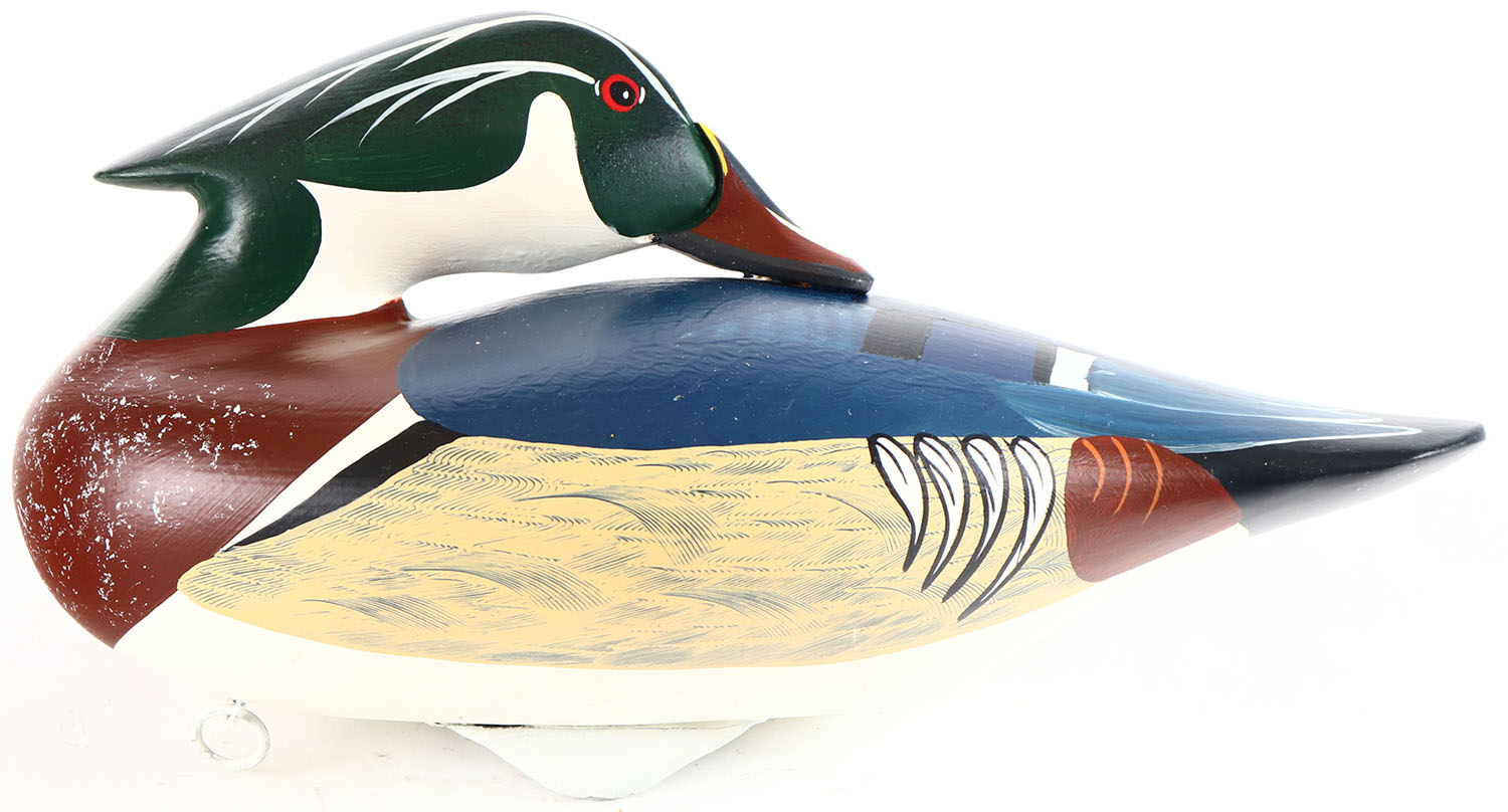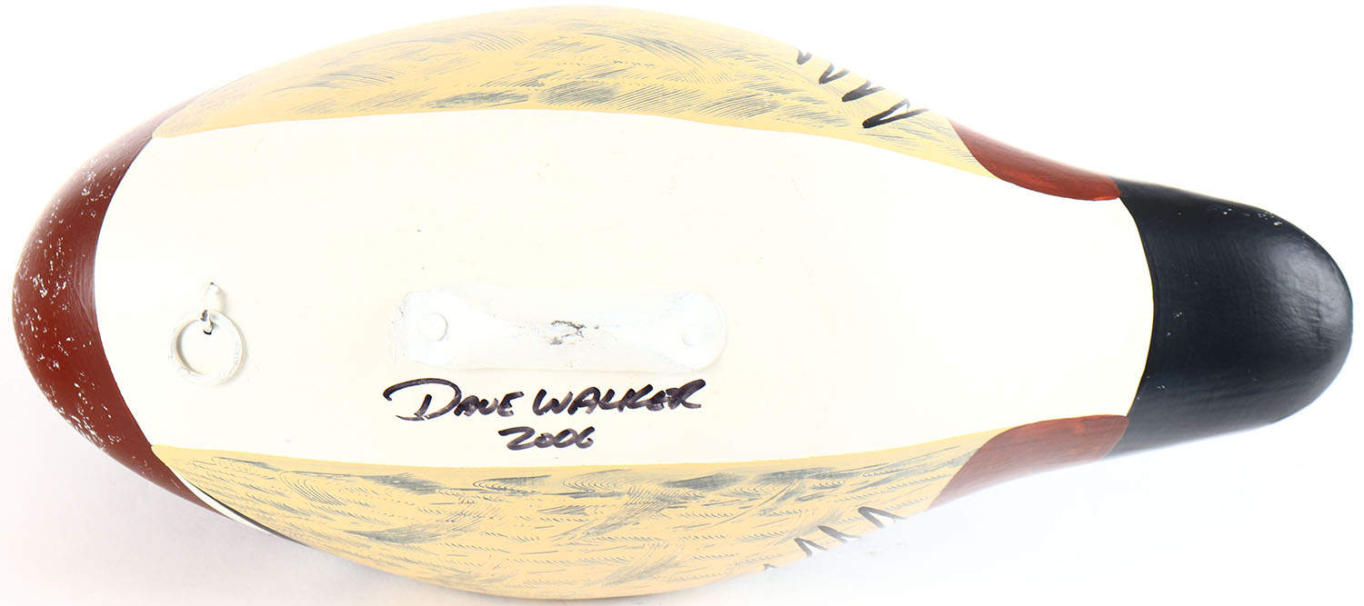 Preening Woodduck Drake by Dave Walker, painted eyes, solid wood, original paint, structurally excellent, signed on bottom. Grade: Excellent ++ - Value: 20 to 40