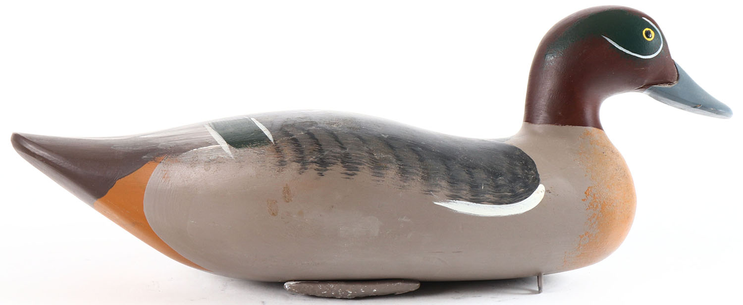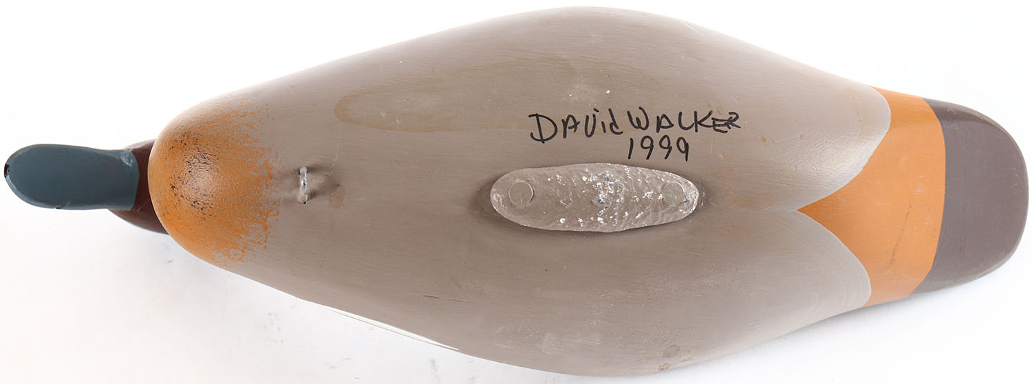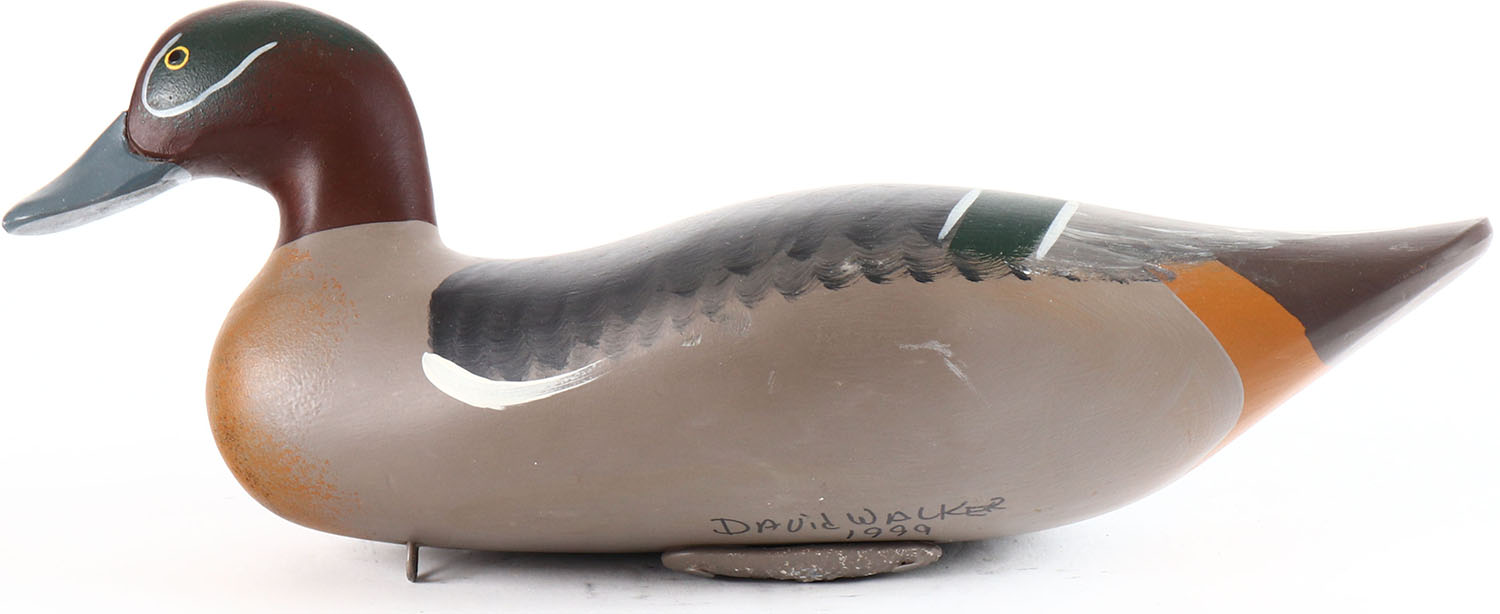 Green Winged Teal Drake by Dave Walker, painted eyes, solid wood, original paint, structurally excellent, signed on bottom. Grade: Excellent ++ - Value: 20 to 40