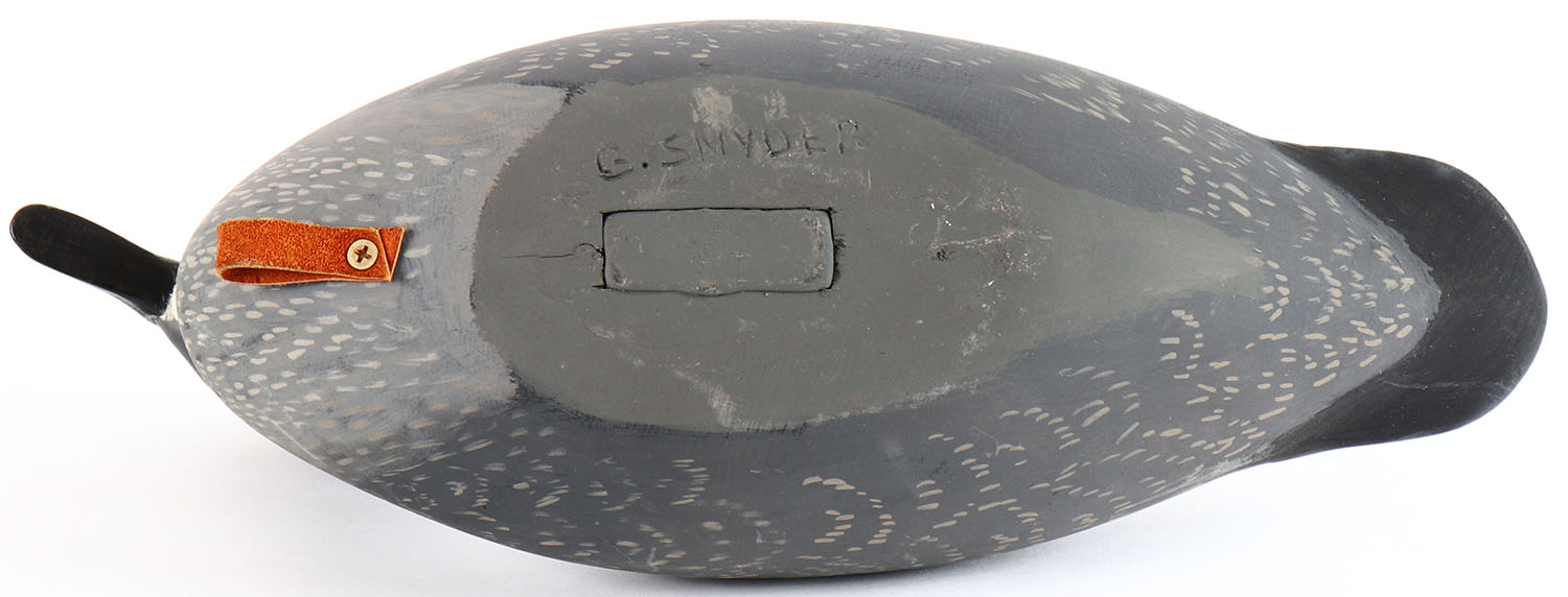 Woodduck Hen by George Snyder, Medford, NJ, glass eyes, solid wood, original paint, structurally excellent, signed on bottom by G. SNYDER. Grade: Excellent + - Value: 40 to 80