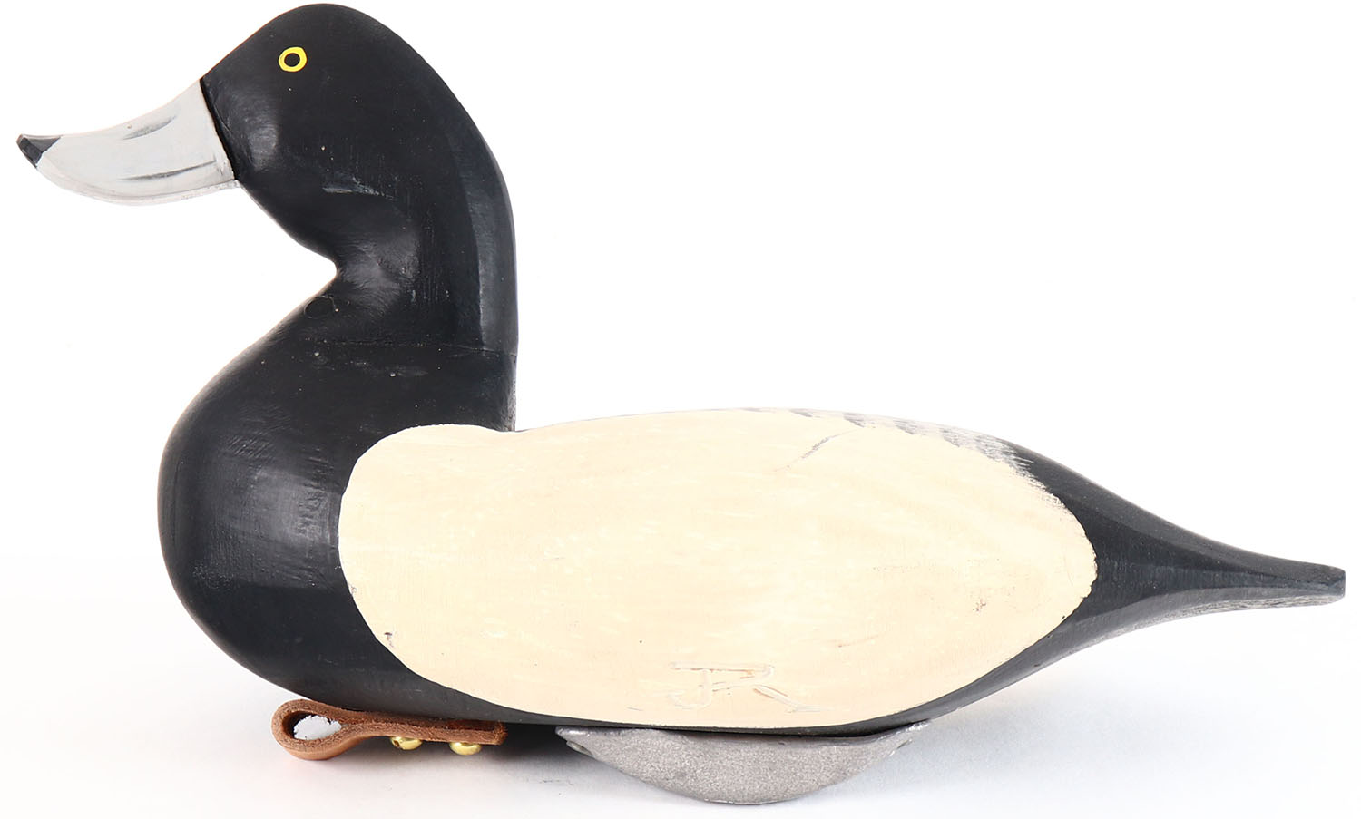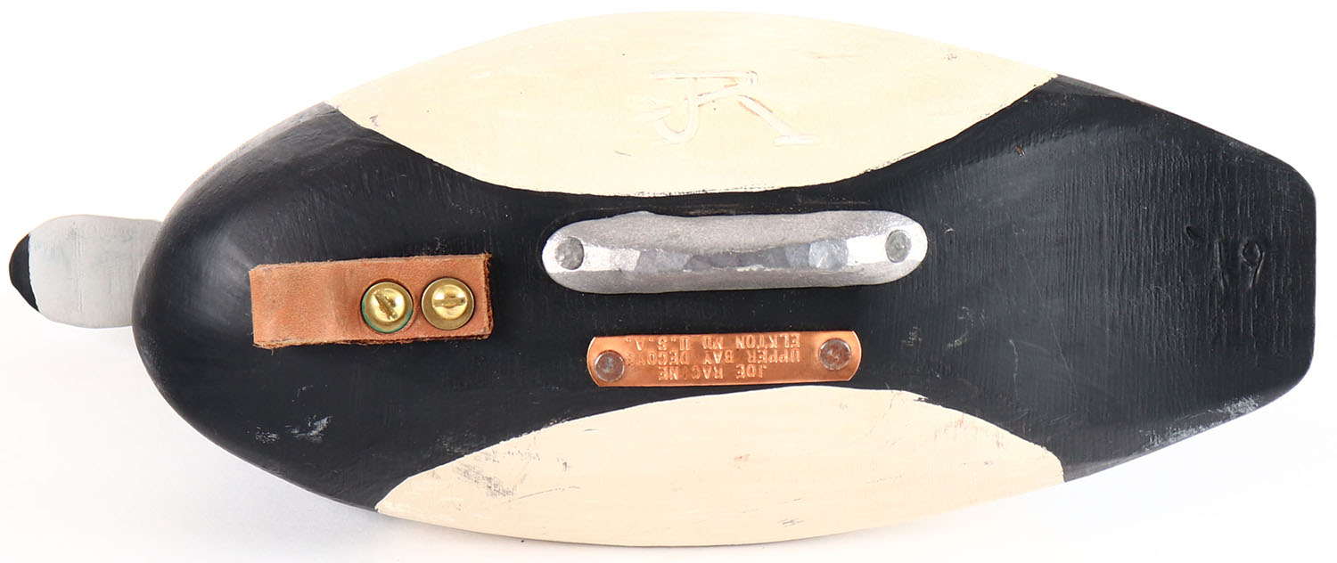 Blue Bill Drake by Joe Racine, Upper Bay Decoys, Elkton Maryland, painted eyes, solid wood, original paint, structurally excellent, branded on bottom by JOE RACINE. Grade: Excellent - Value: 20 to 40