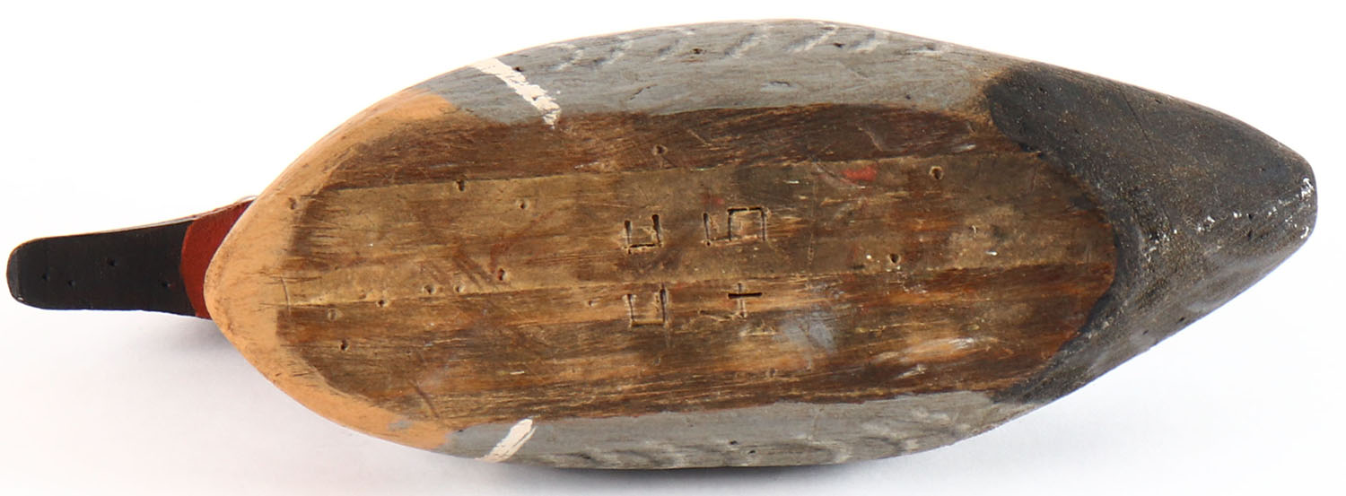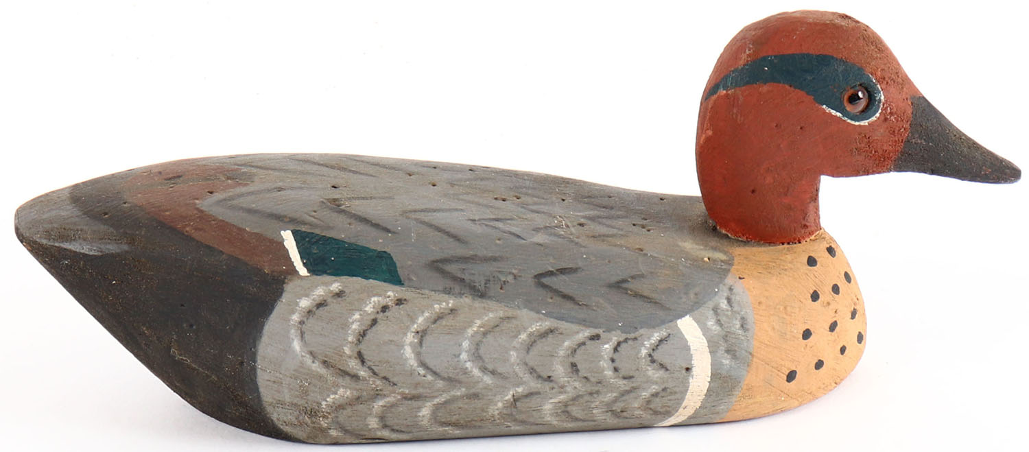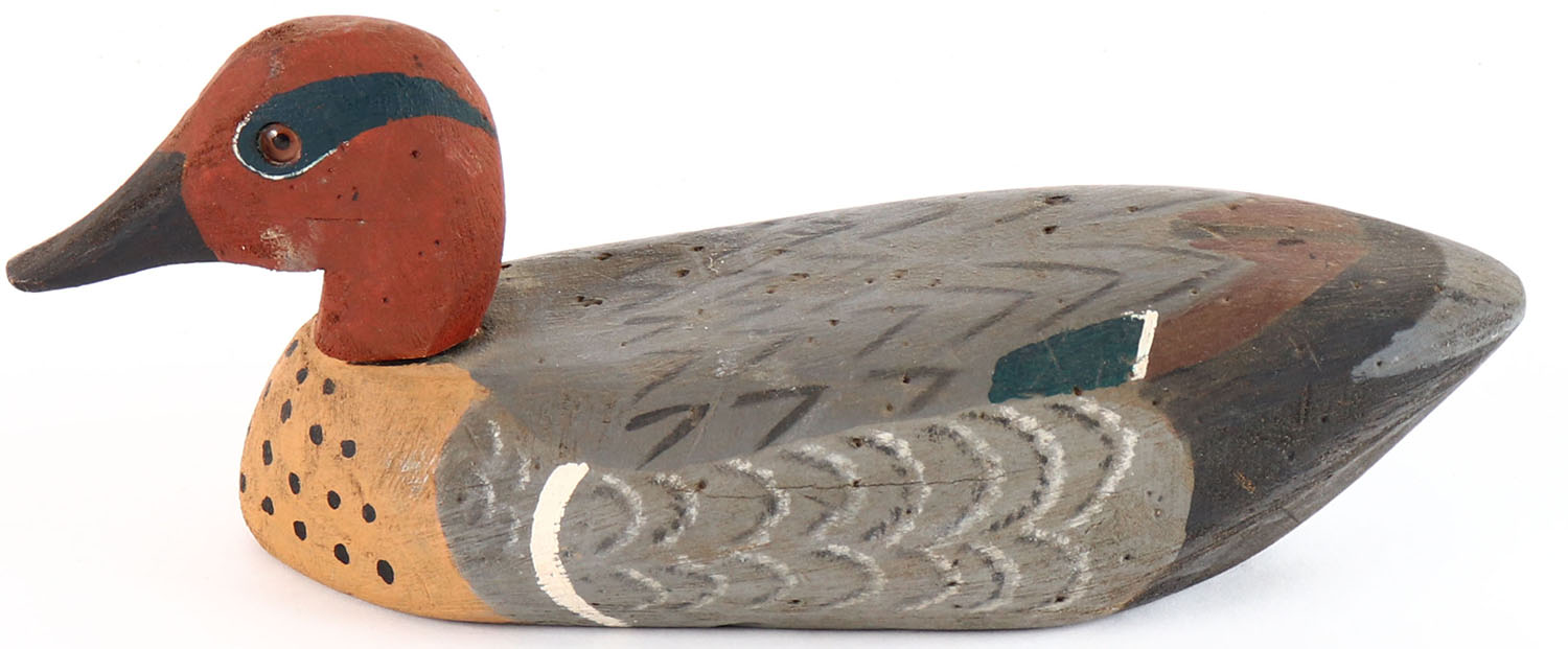 Green Winged Teal Drake by unknown maker, glass eyes, solid wood, original paint, structurally excellent. Grade: Excellent - Value: 20 to 40