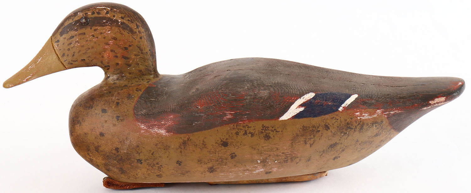 Mallard Hen Dodge Decoy Factory, Detroit, MI, 1883-1893, tack eyes, solid wood, restored paint, sructurally excellent. Grade: Very Good ++ - Value: 40 to 80