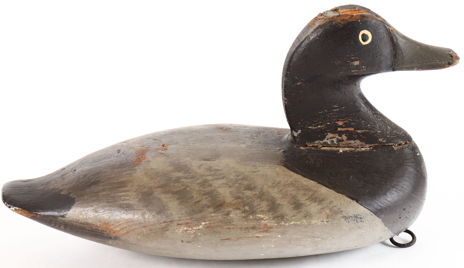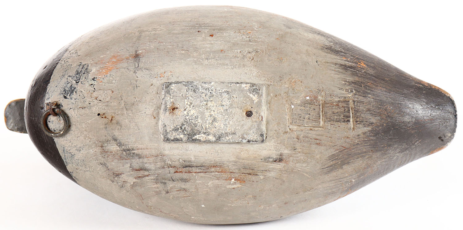 Bluebill Hen by unknown maker, painted eyes, solid wood, original paint, head shows paint missing and an old repair. Grade: Very Good - Value: 20 to 40