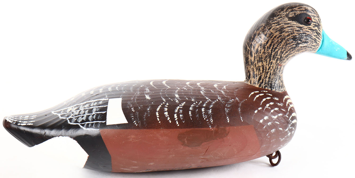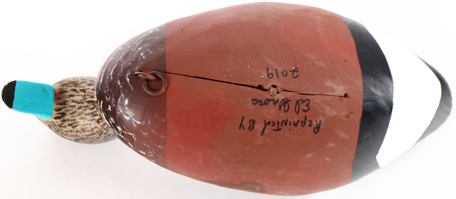 Widgeon Drake by unknown maker, glass eyes, solid wood, repainted, has age crack on bottom. Grade: Very Good + - Value: 10 to 20