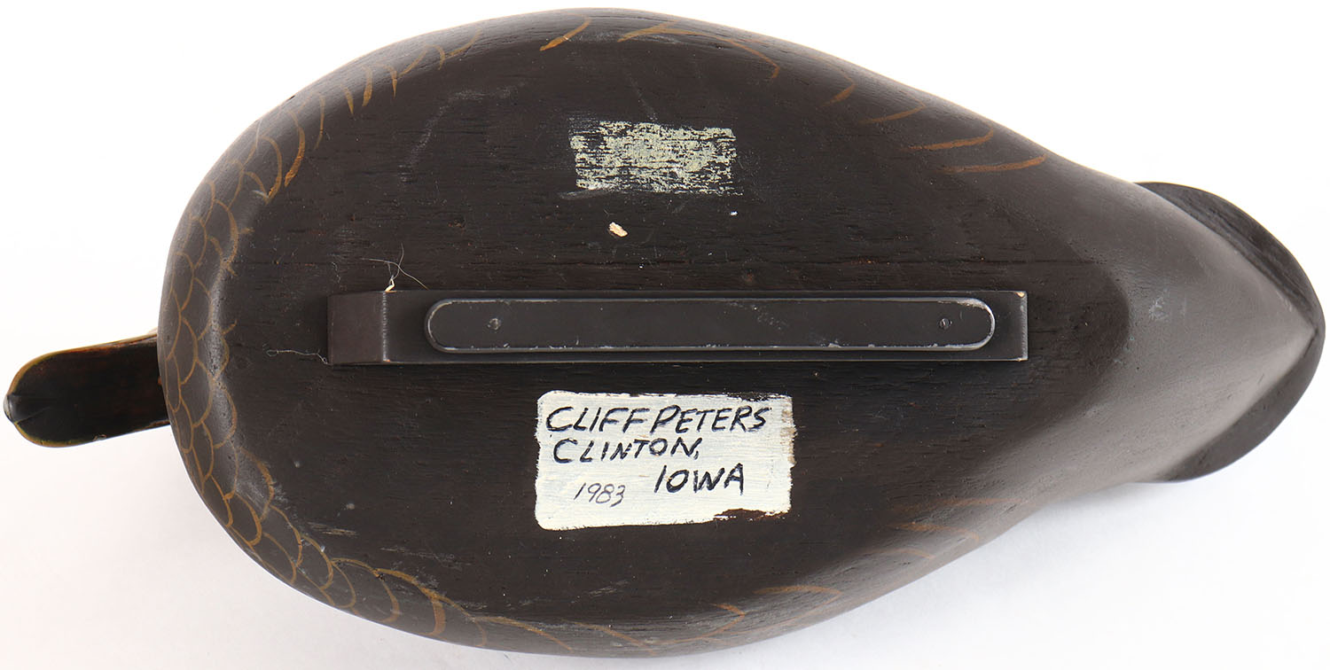 Black Duck by Cliff Peters, Clinton, Iowa, glass eyes, hollow wood, original paint, structurally excellent. Grade: Excellent + - Value: 30 to 60