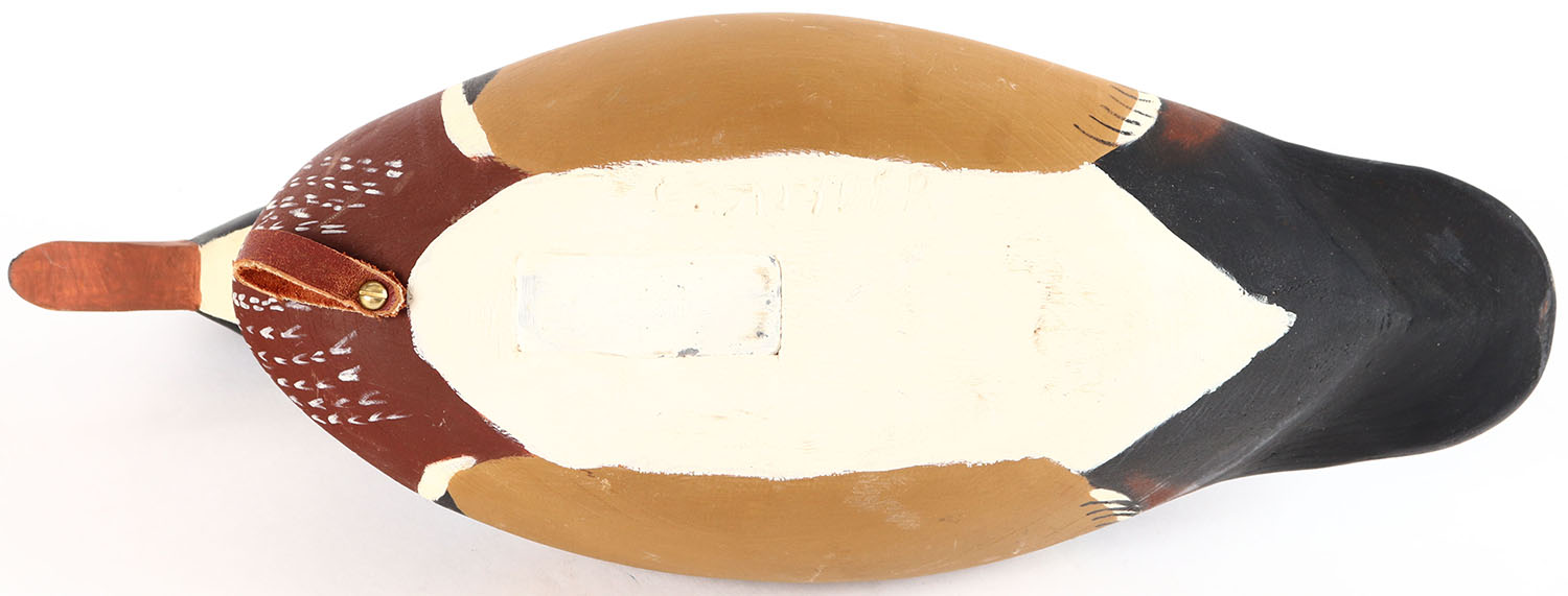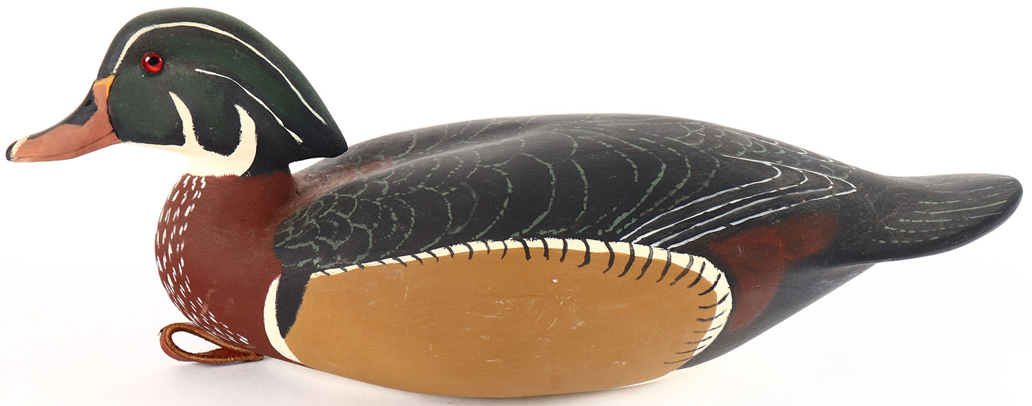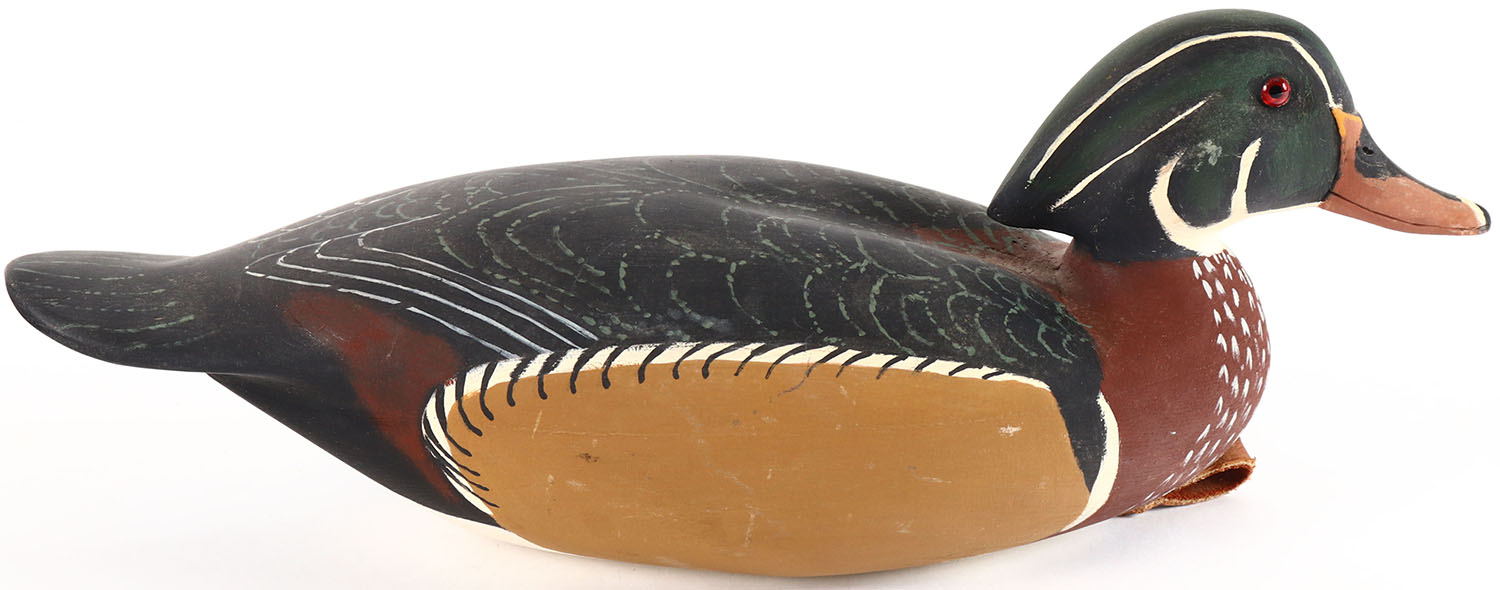 Woodduck Drake by George Snyder, Medford, NJ, glass eyes, hollow wood, original paint, structurally excellent, branded by G. SNYDER on bottom. Grade: Excellent - Value: 30 to 60