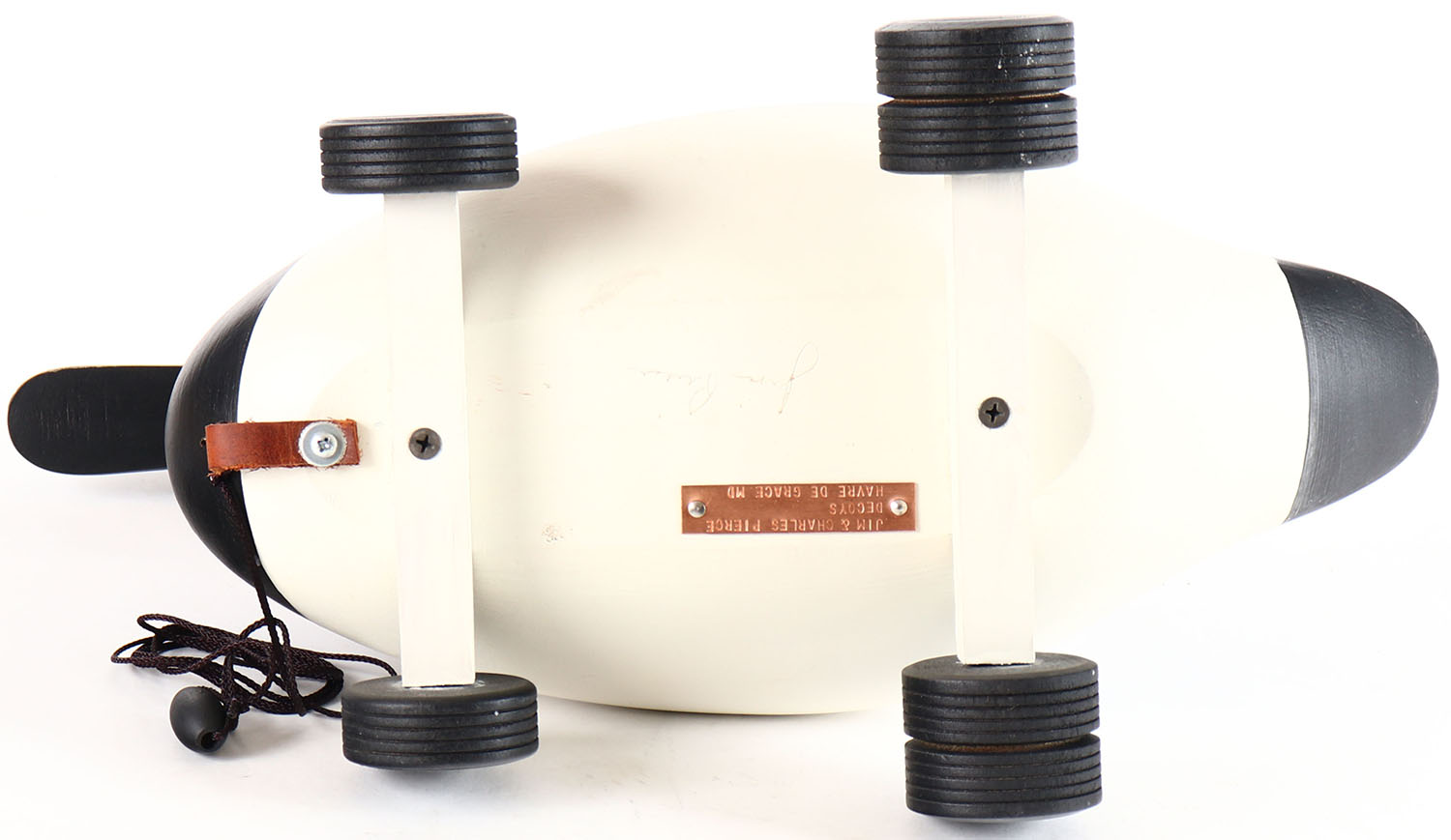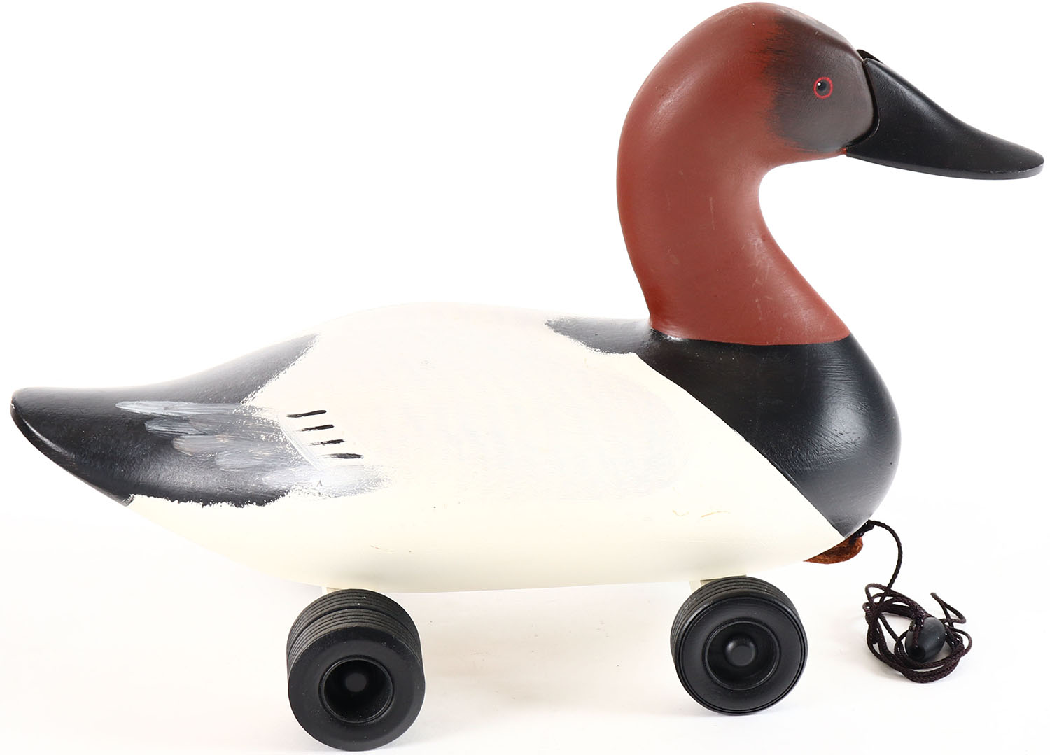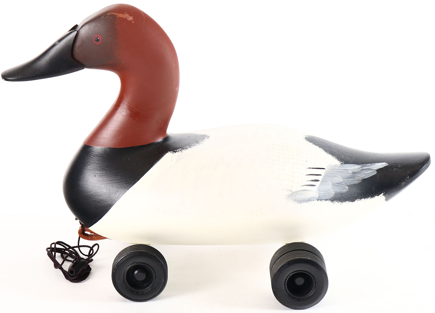 Canvasback Drake by Jim and Charles Pierce, Havre De Grace, MD, on wheels and has string to pull it, painted eyes, solid wood, original paint, structurally excellent, branded by JIM AND CHARLES PIERCE on bottom. Grade: MINT - Value: 100 to 200