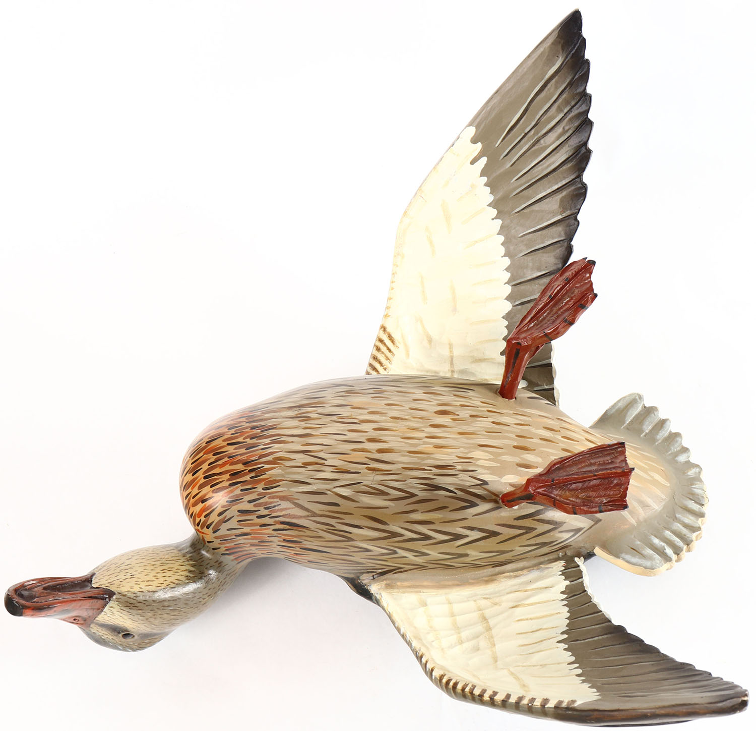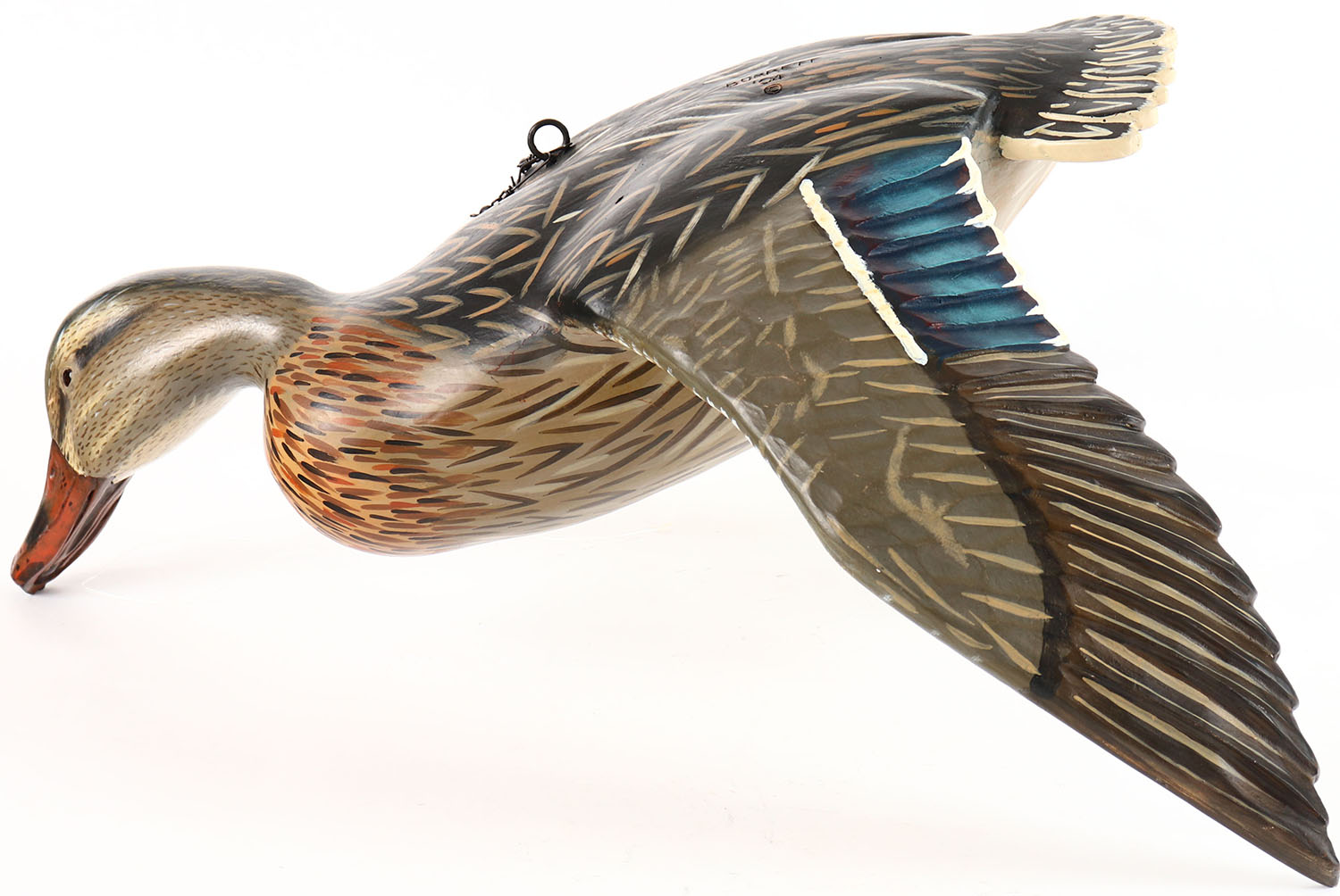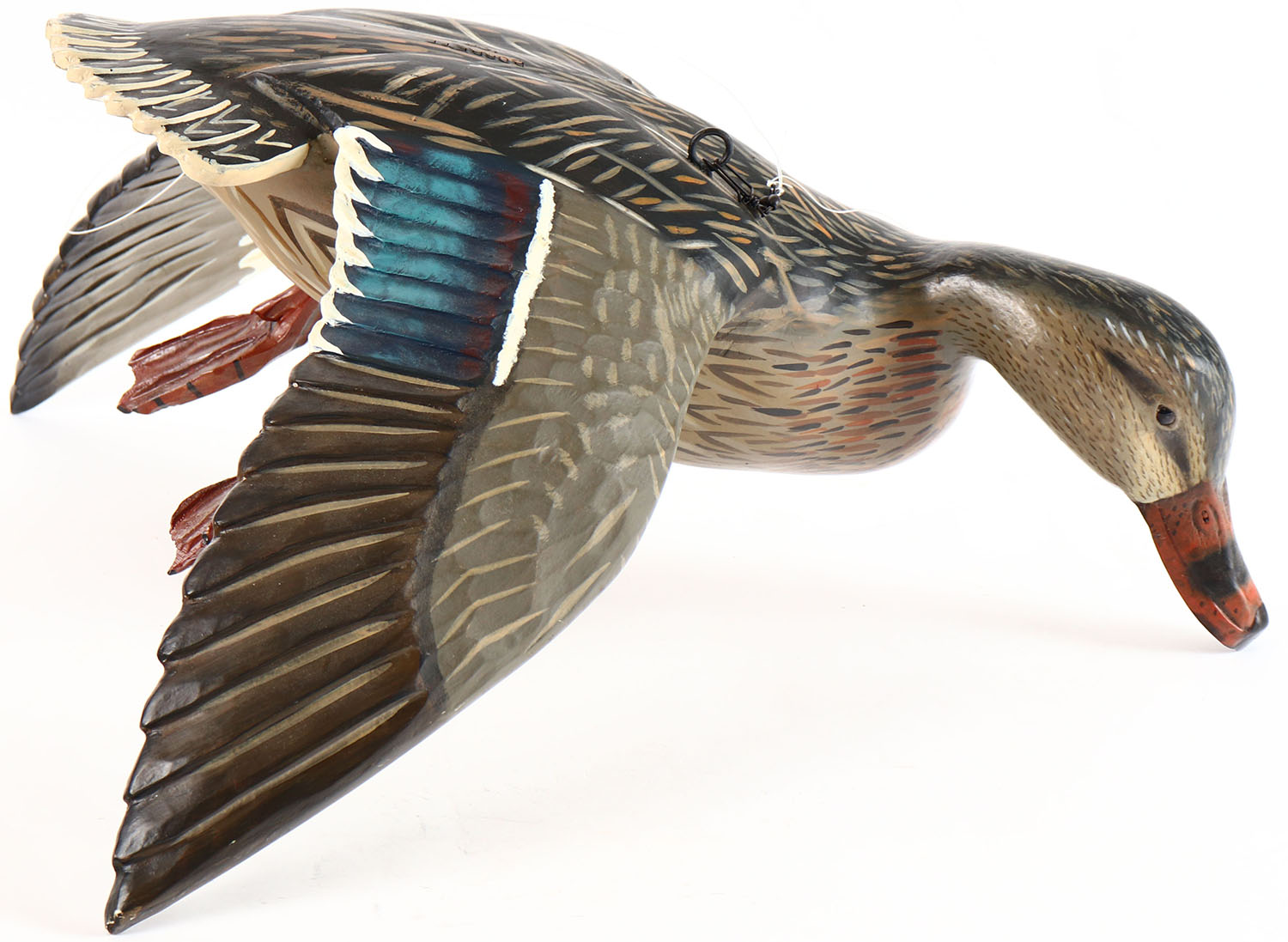 Mallard Hen by Mike Borrett Madison, WI, tilted with wings cupped, glass eyes, resin cast from 2004, original paint, structurally excellent. Grade: Excellent ++ - Value: 40 to 400