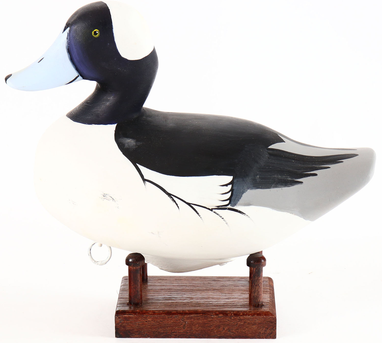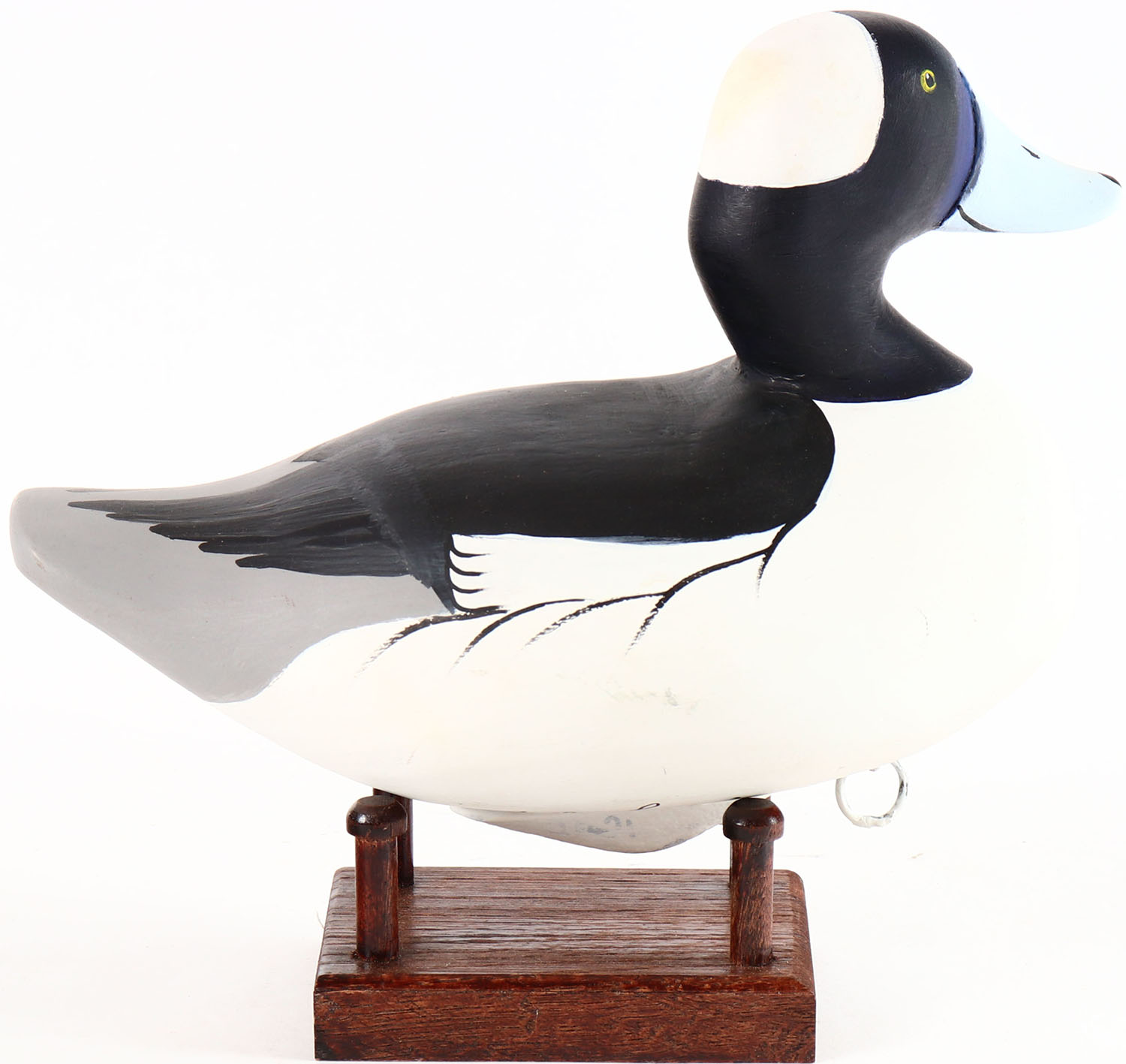 Bufflehead Drake on wood stand by Bucky Leonard, glass eyes, solid wood, original paint, structurally excellent. Grade: MINT - Value: 40 to 80