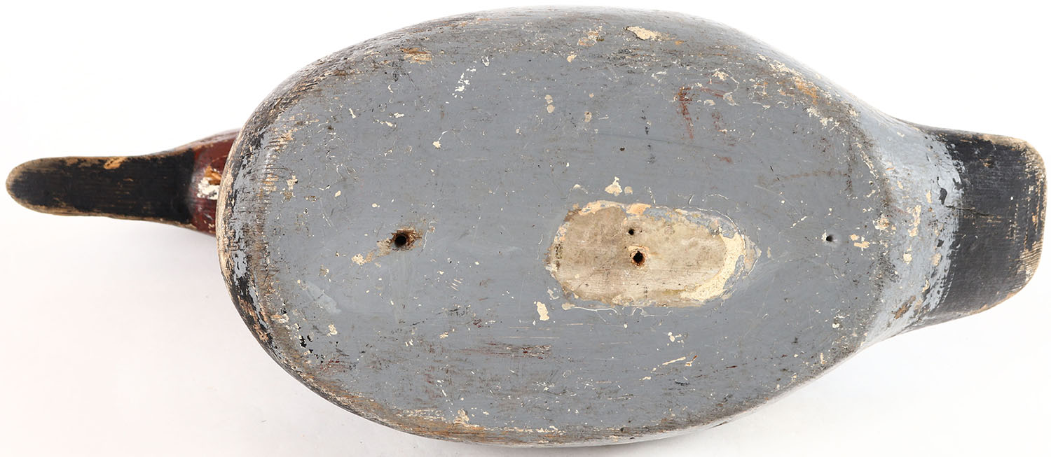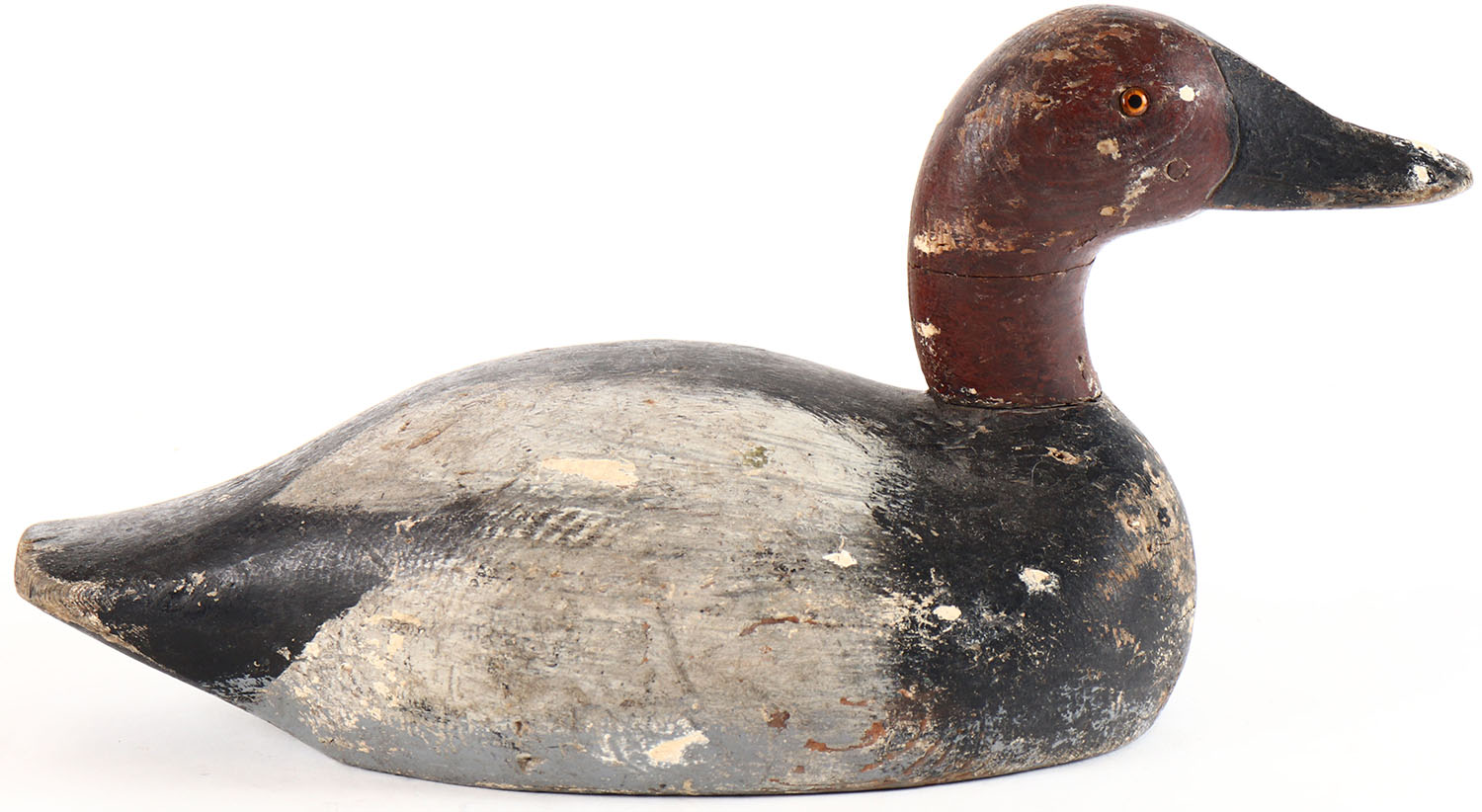 Canvasback Drake by Mason Decoy Company, Detroit, MI, 1896-1924, Seneca model, glass eyes, solid wood, repainted, paint has chips in it. Grade: Very Good - Value: 40 to 80