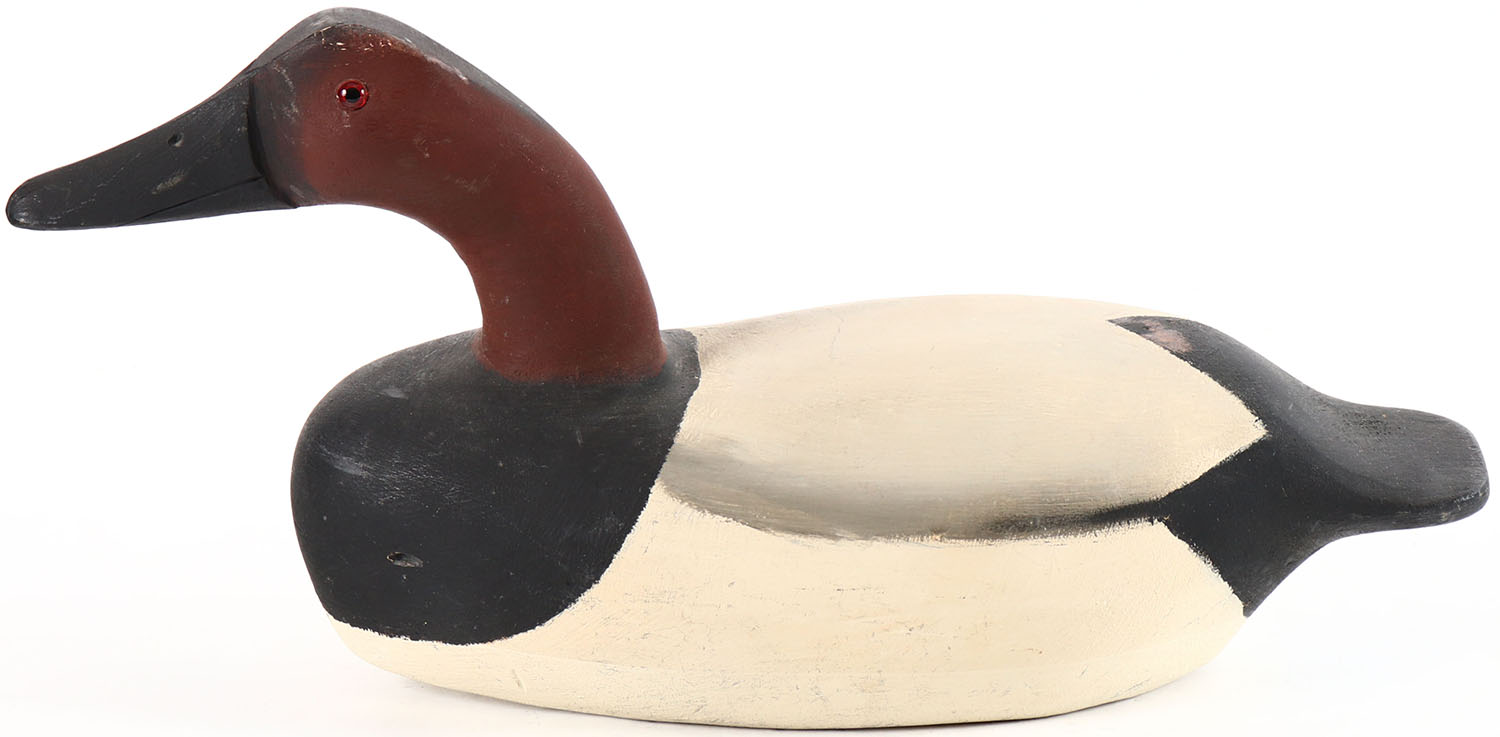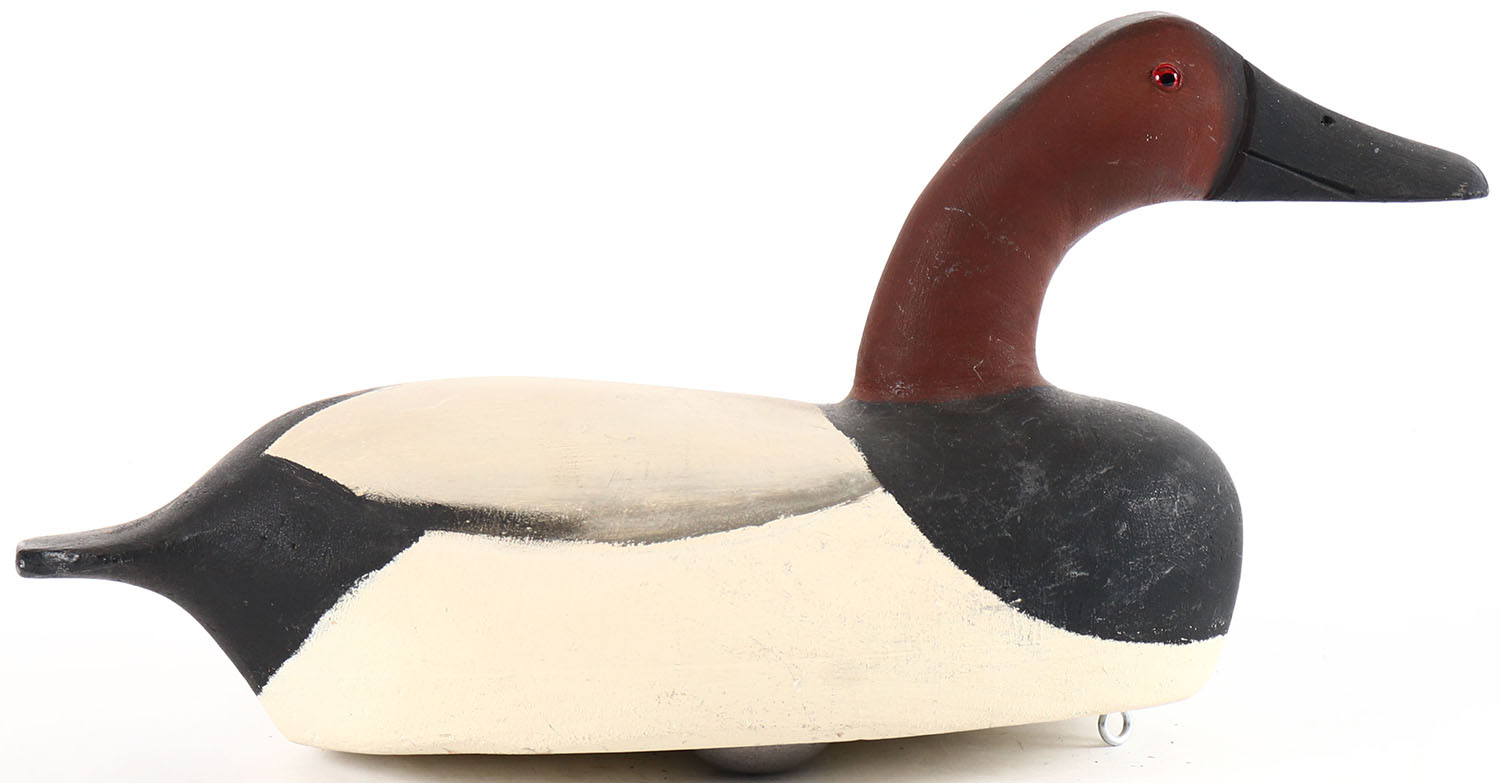 Canvasback Drake by Ron Koch, Omro, WI, glass eyes, hollow wood, original paint, structurally excellent, stamped on bottom. Grade: Excellent + - Value: 40 to 80