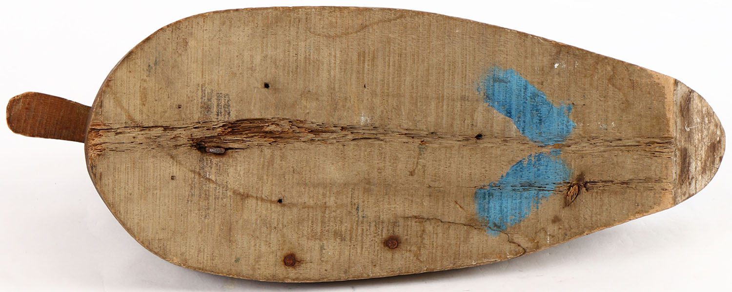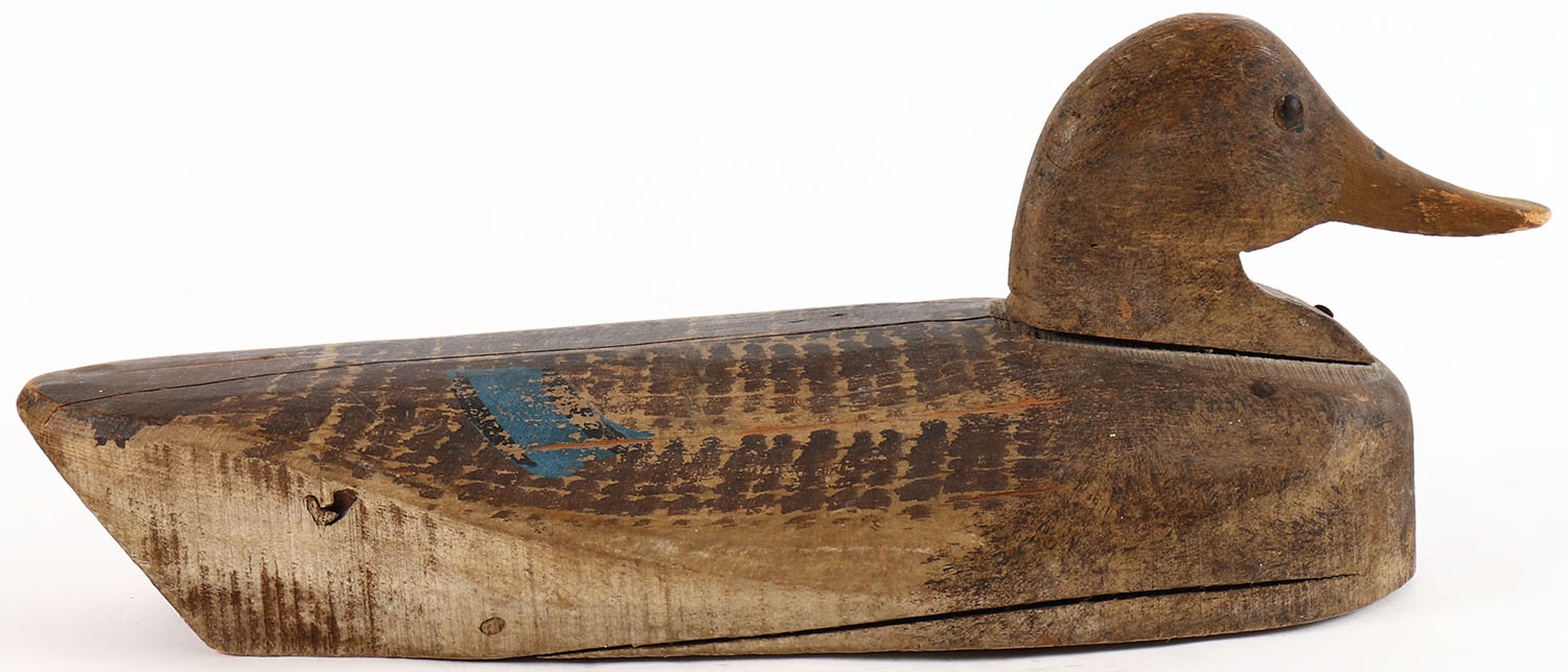 Mallard Hen by unknown maker, tack eyes, solid wood, original paint, has age cracks on back and bottom. Grade: Very Good ++ - Value: 10 to 30