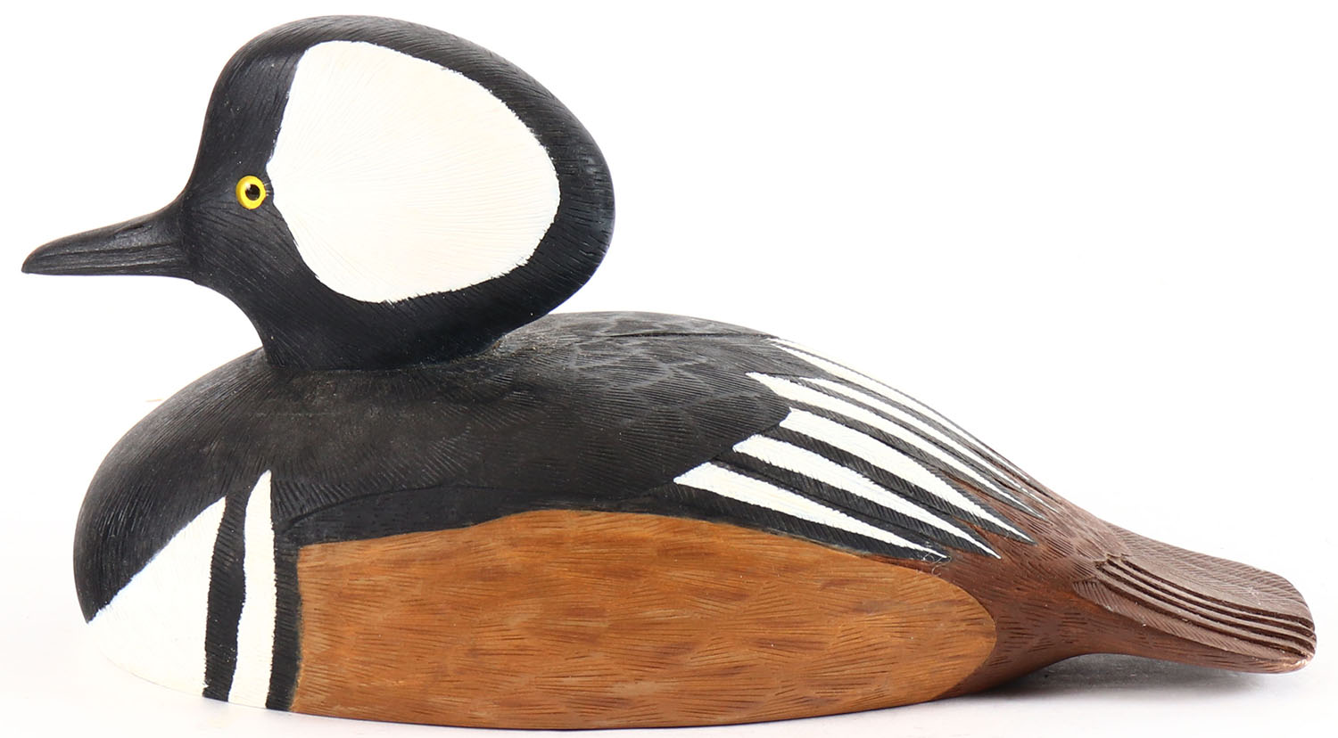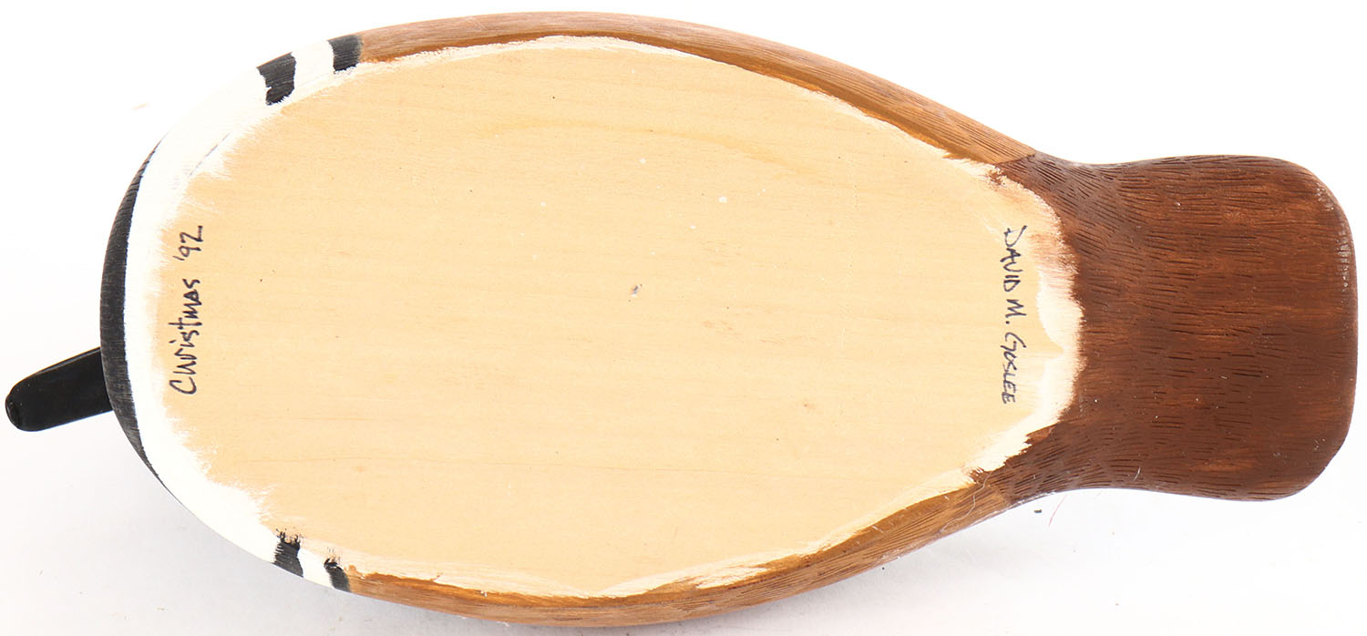 Hooded Merganser by David M. Goslee, glass eyes, solid wood, original paint, structurally excellent, signed by DAVID M. GOSLEE on bottom. Grade: Excellent ++ - Value: 20 to 40