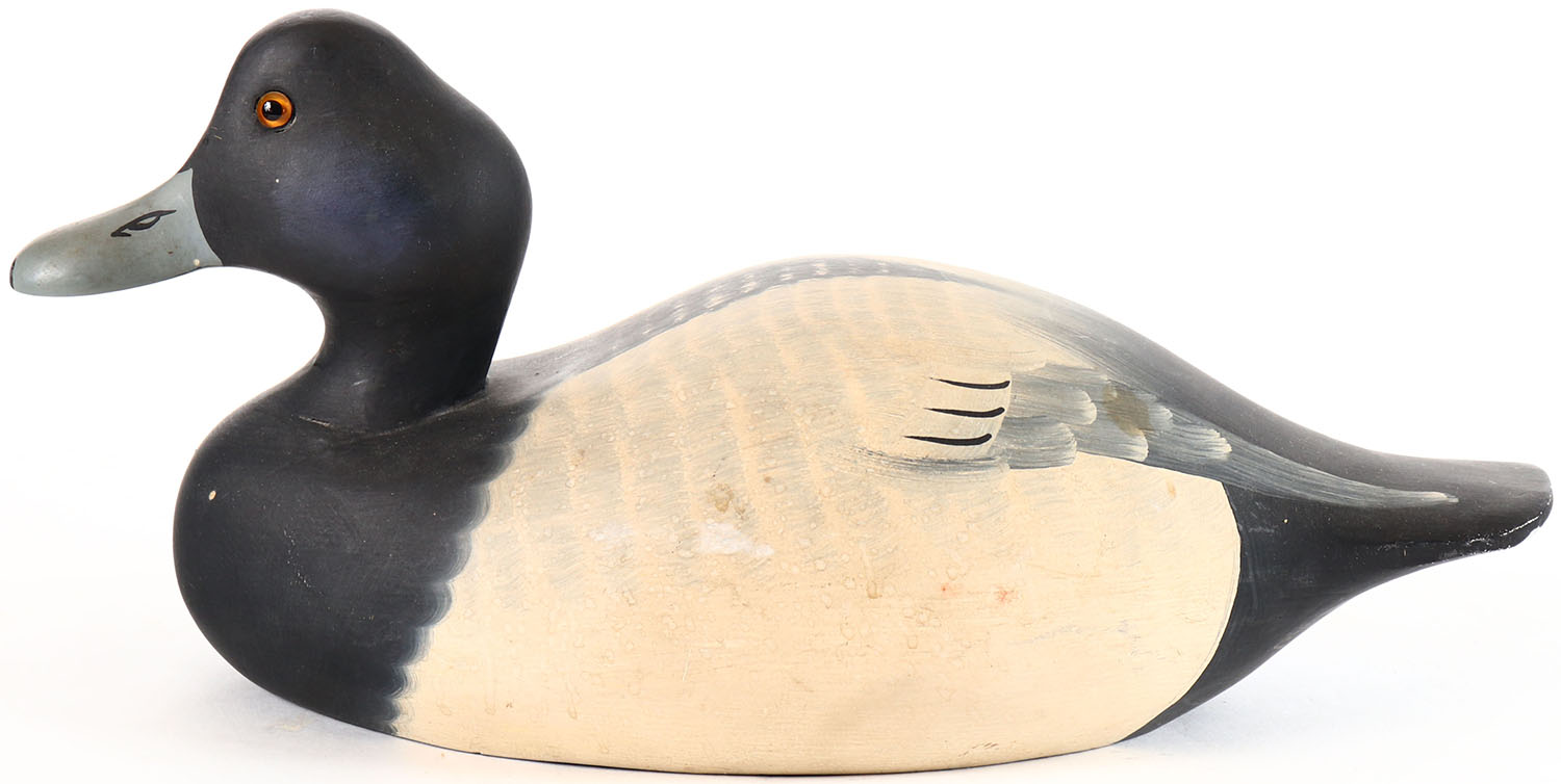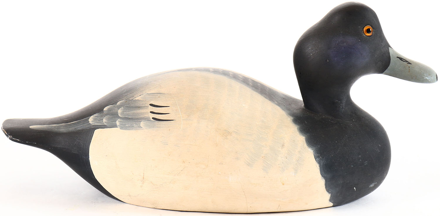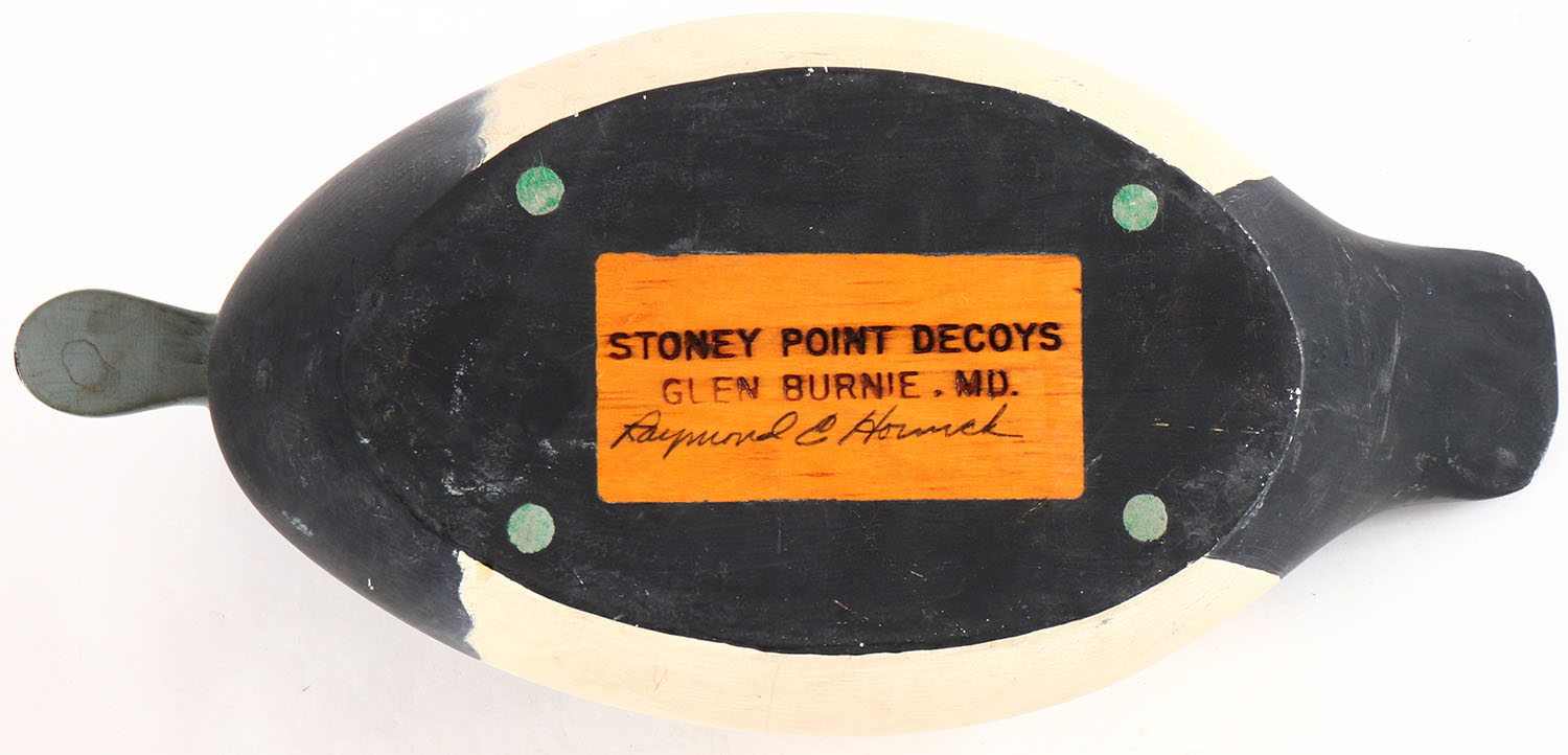 Bluebill Drake by Hornick Bros Stoney Point Decoys, Oak Hall Virginia, glass eyes, solid wood, original paint, structurally excellent, branded by STONEY POINT DECOYS on bottom. Grade: Excellent + - Value: 10 to 20