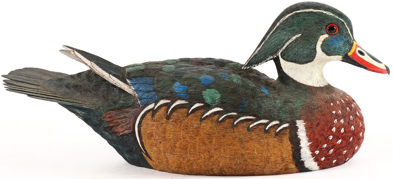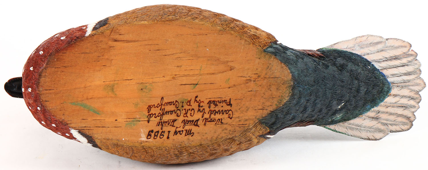 Woodduck Drake by C.R. Crawford, glass eyes, solid wood, original paint, structurally excellent, branded on bottom by C.R. CRAWFORD. Grade: Excellent + - Value: 26 to 50