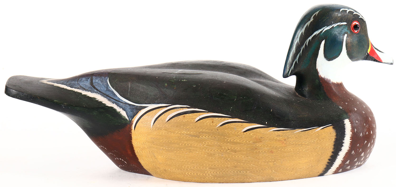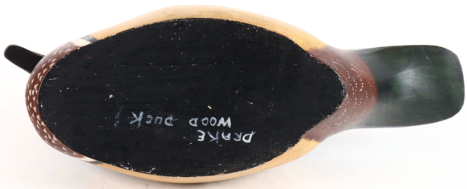 Woodduck Drake by unknown maker, glass eyes, hollow wood, original paint with a couple minor wear pots, structurally excellent. Grade: Excellent + - Value: 30 to 60