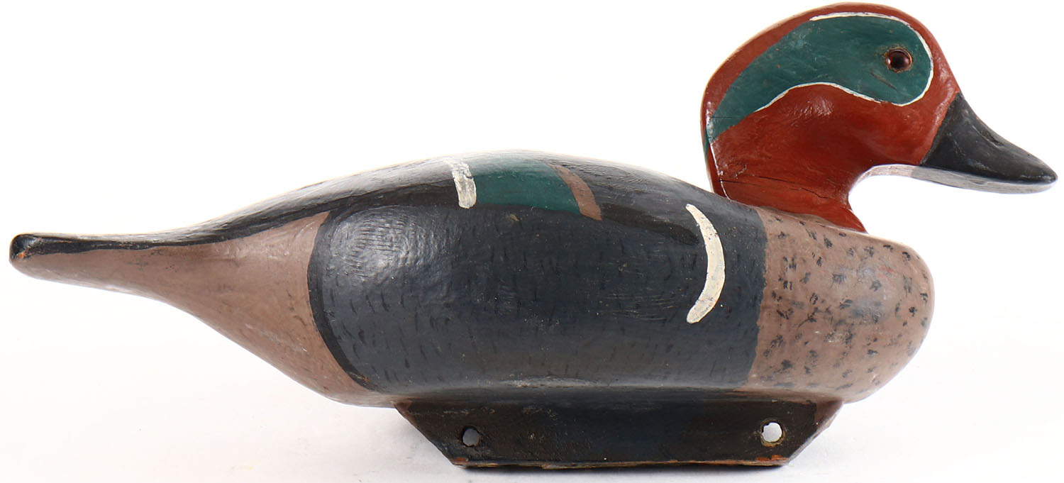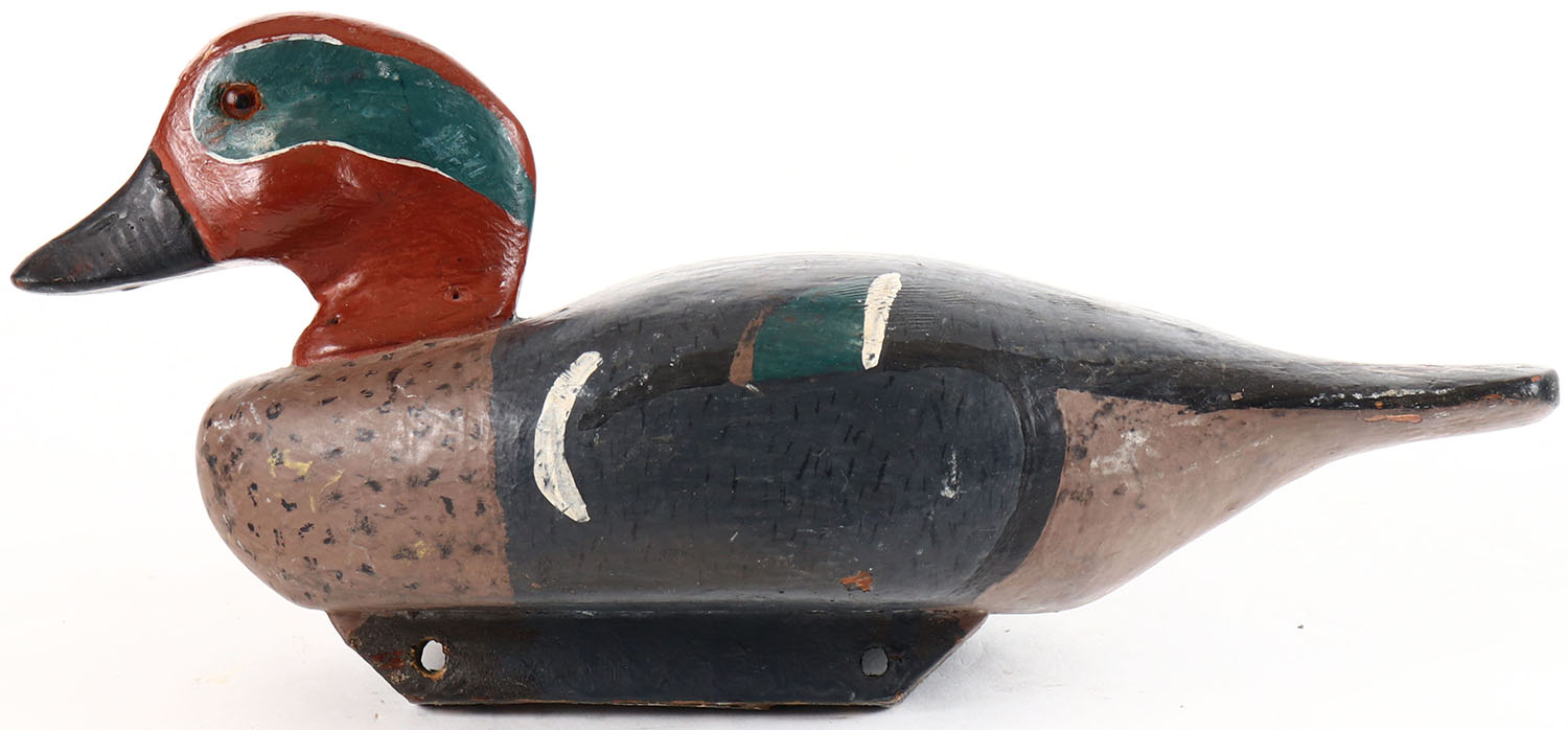 Green Winged Teal Drake by unknown maker, glass eyes, hollow wood, original paint, structurally excellent. Grade: Excellent + - Value: 20 to 40