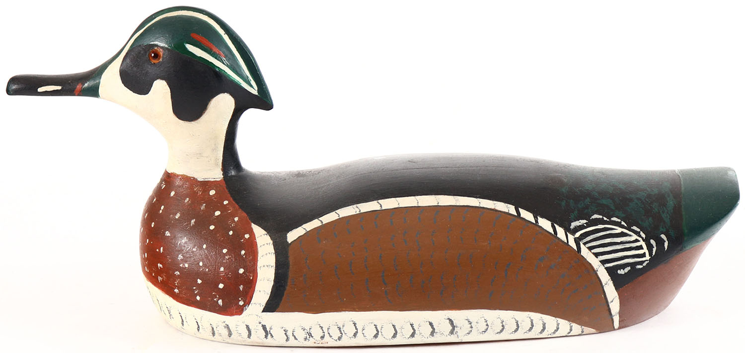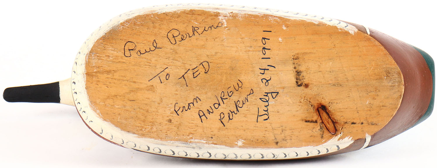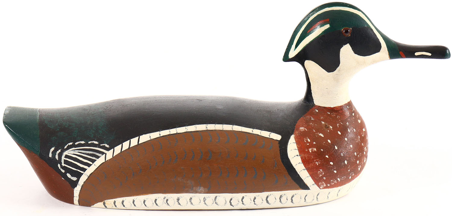 Woodduck Drake by unknown maker from a Perkins family as signed, glass eyes, solid wood, original paint, structurally excellent. Grade: Excellent + - Value: 20 to 40