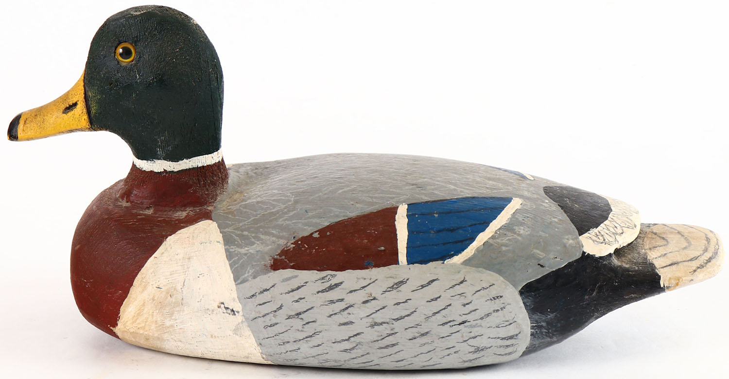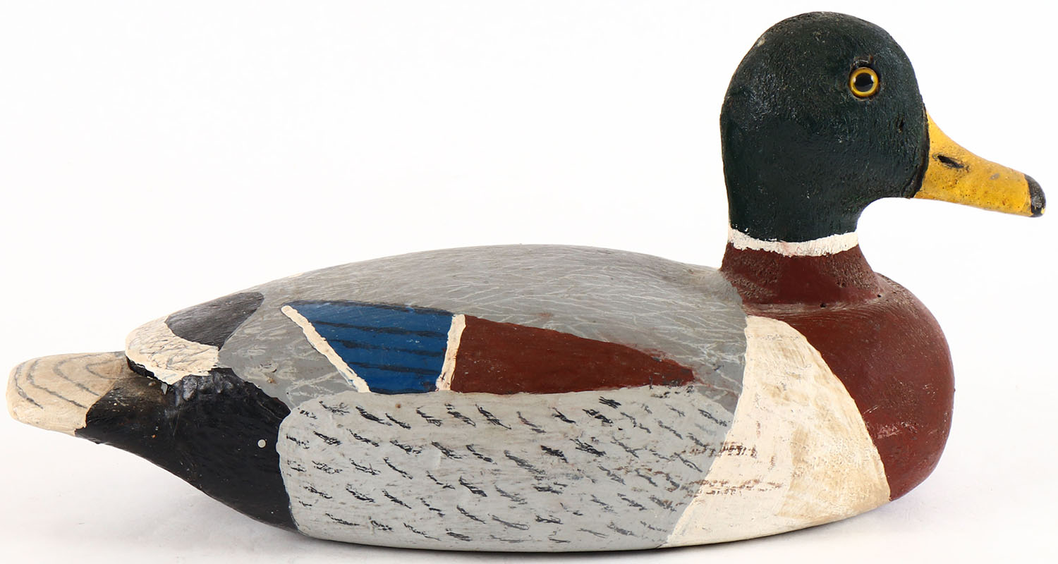 Mallard Drake by with illegible signature on bottom, glass eyes, solid wood, original paint, structurally excellent. Grade: Excellent - Value: 20 to 40