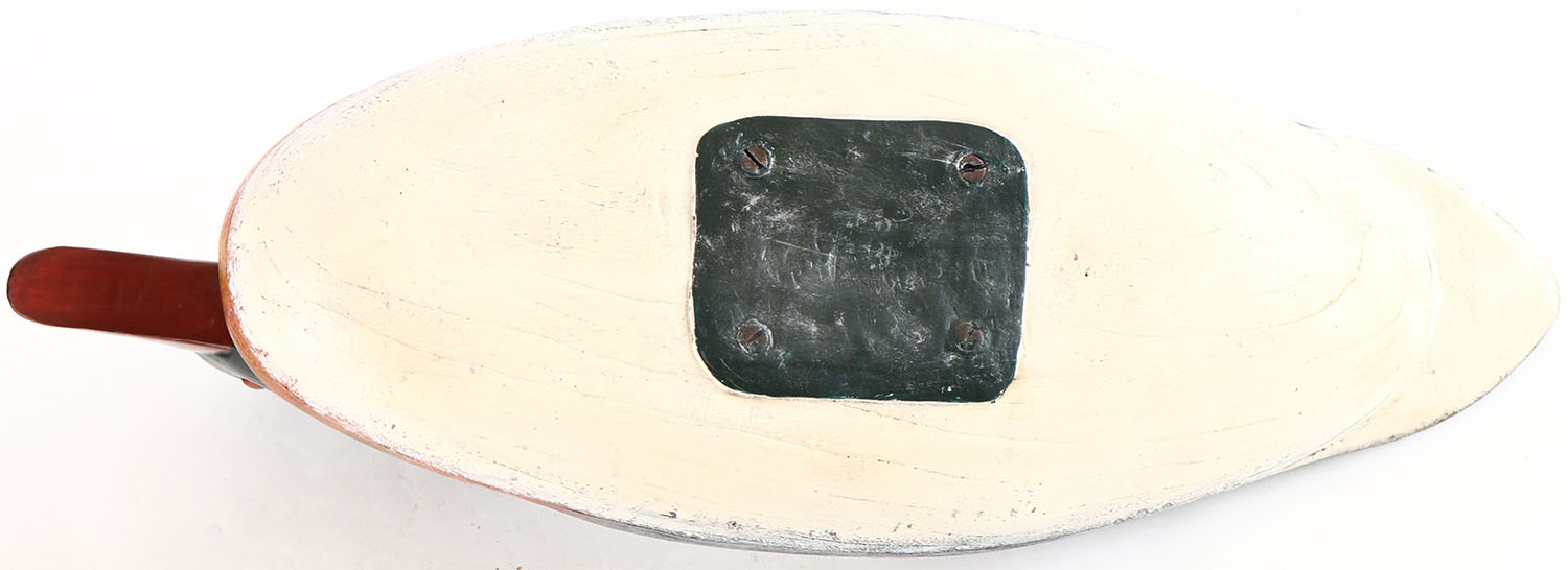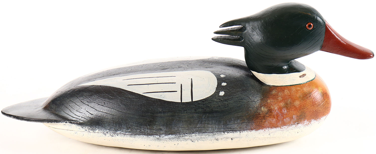 Hooded Merganser Drake by unknown maker in the style of Rowley Horner, tack eyes, solid wood, original paint, structurally excellent. Grade: Excellent - Value: 20 to 40