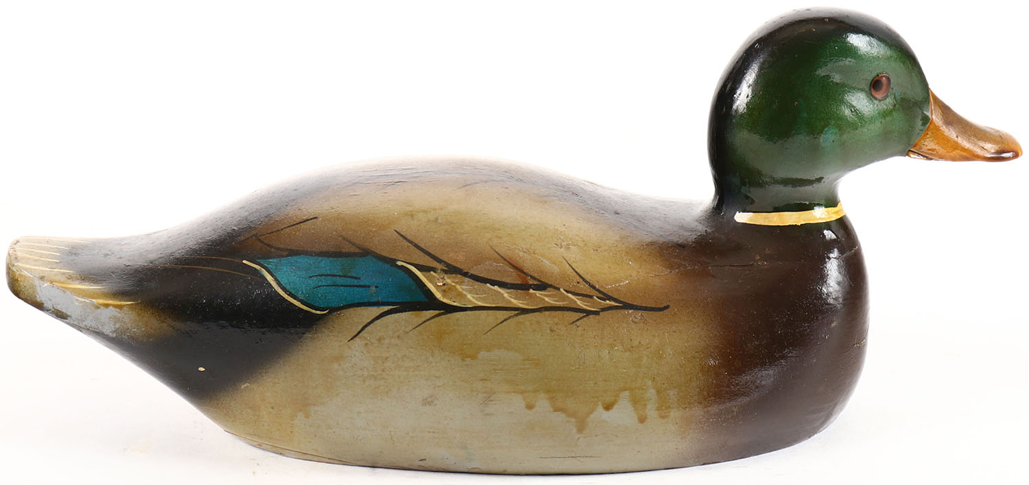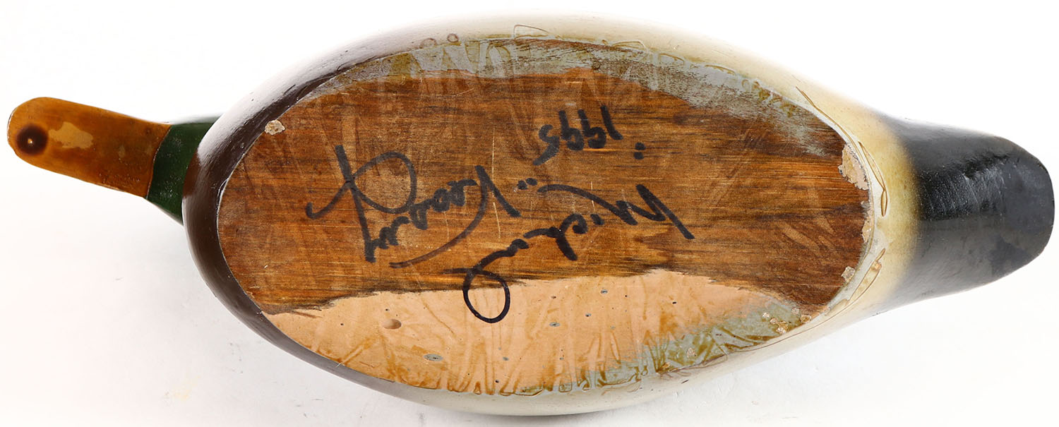Small Mallard Drake by Michael Veasy, glass eyes, solid wood, original paint with an old coat of varnish added, structurally excellent, signed by MICHAEL VEASY on bottom. Grade: Excellent + - Value: 20 to 40