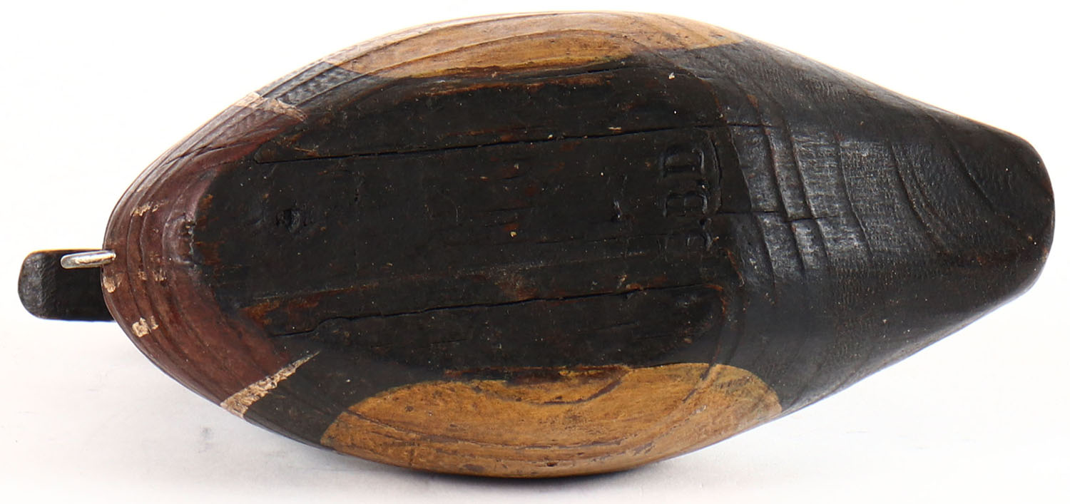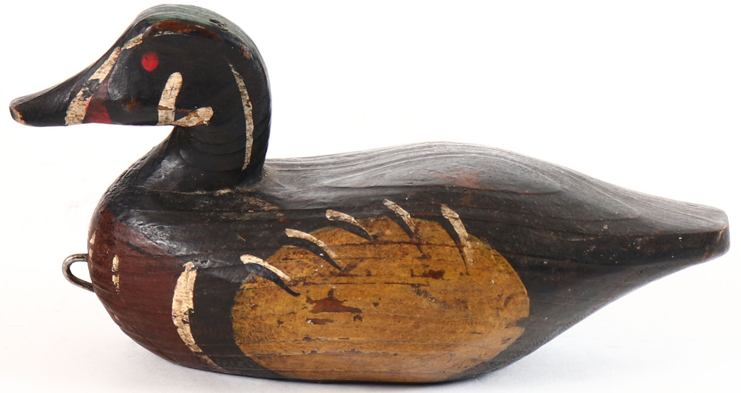 Small Woodduck Drake by Back Bay Decoys, Virginia Beach, VA, painted eyes, solid wood, distressed original paint, structurally excellent. Grade: Excellent - Value: 20 to 40