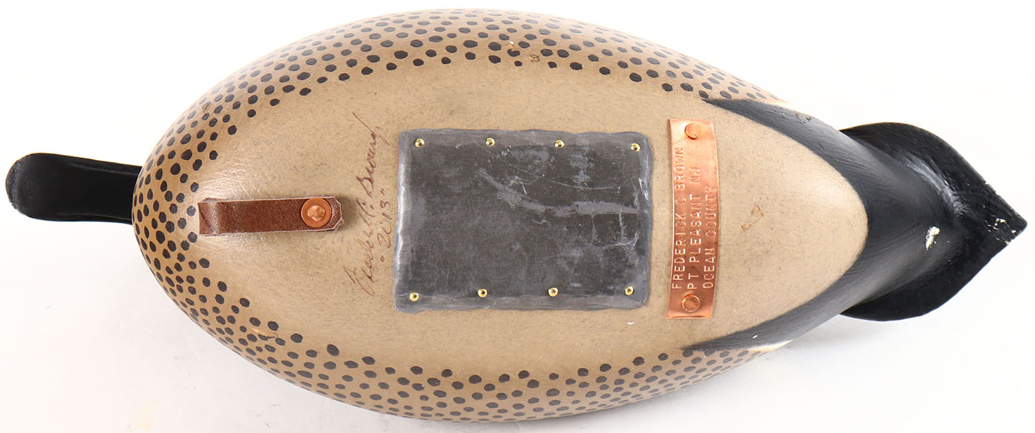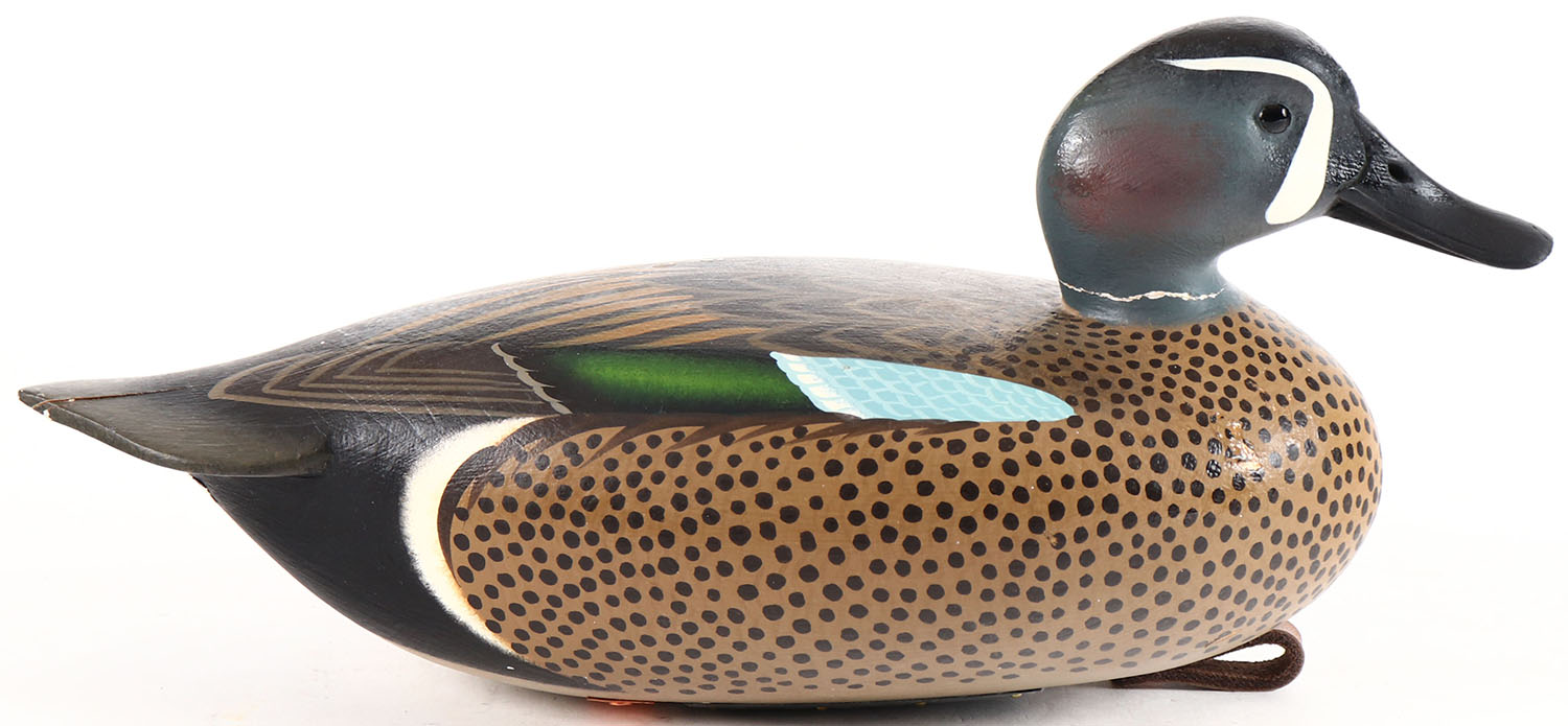 Blue Winged Teal Drake by Frederick Rick Brown, PT Pleasant, NJ. Glass eyes, hollow wood, original paint, branded by FREDERICK C. BROWN on bottom, has age crack on tail, chips under neck. Grade: Very Good + - Value: 40 to 80