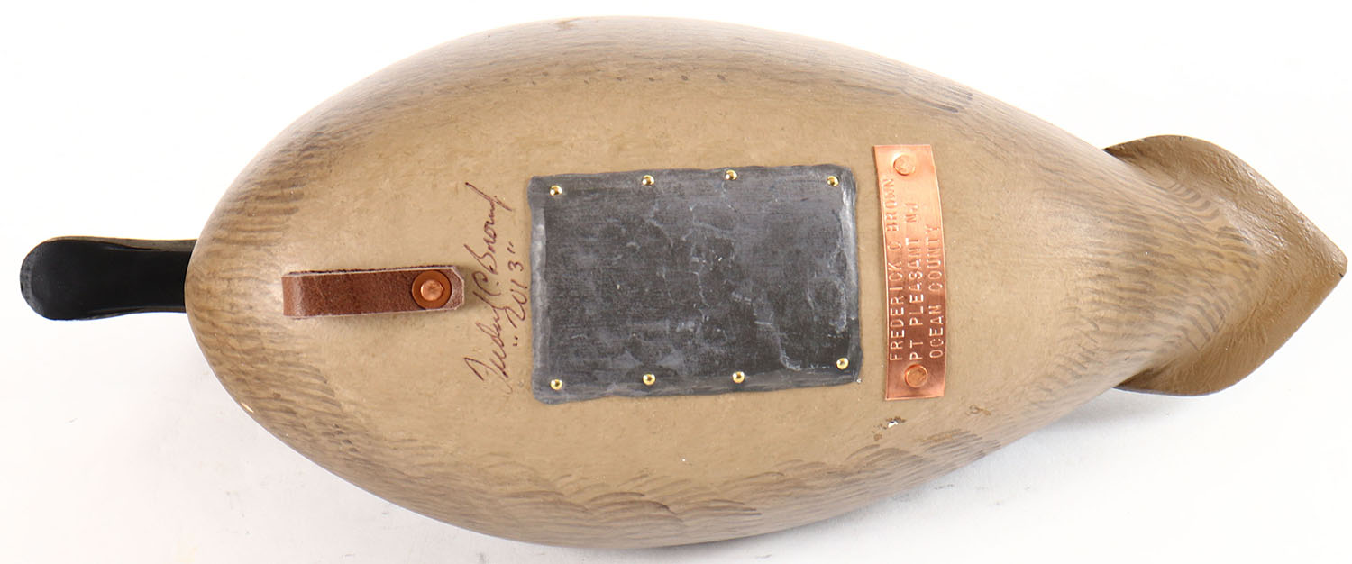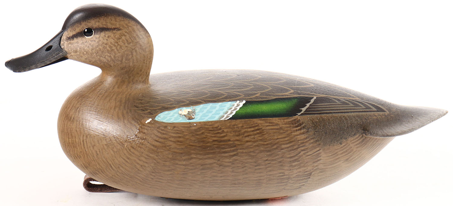 Blue Winged Teal Hen by Frederick ''Rick'' Brown, PT Pleasant, NJ, glass eyes, hollow wood, original paint with some wear on wing, structurally excellent, branded by FREDERICK C. BROWN on bottom. Grade: Excellent - Value: 40 to 80