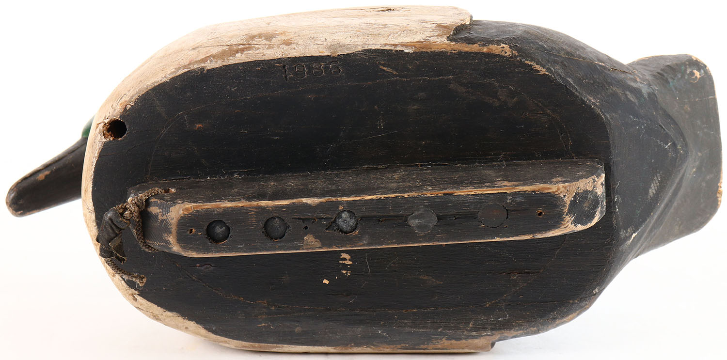 Goldeneye Drake by unknown maker, glass eyes, solid wood, original paint, has age cracks under neck. Grade: Very Good + - Value: 20 to 40