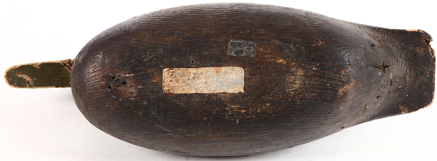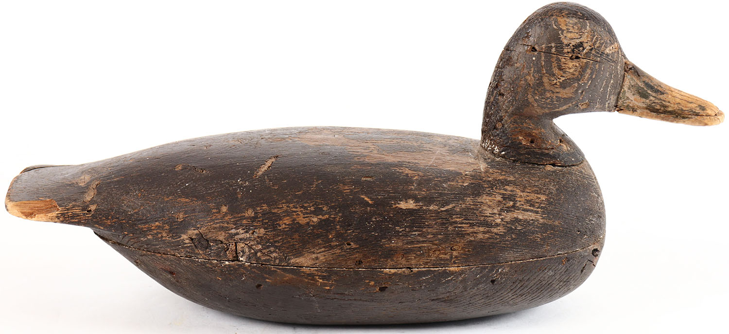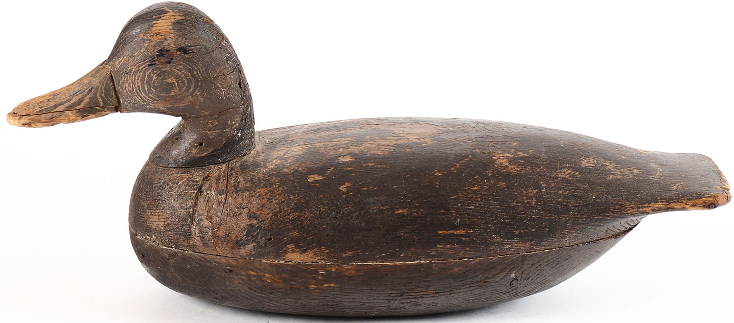 Mallard Hen by unknown New Jersy maker, no eyes, solid wood, mostly worn original paint, tail has chip, body has age cracks. Grade: Very Good + - Value: 40 to 80