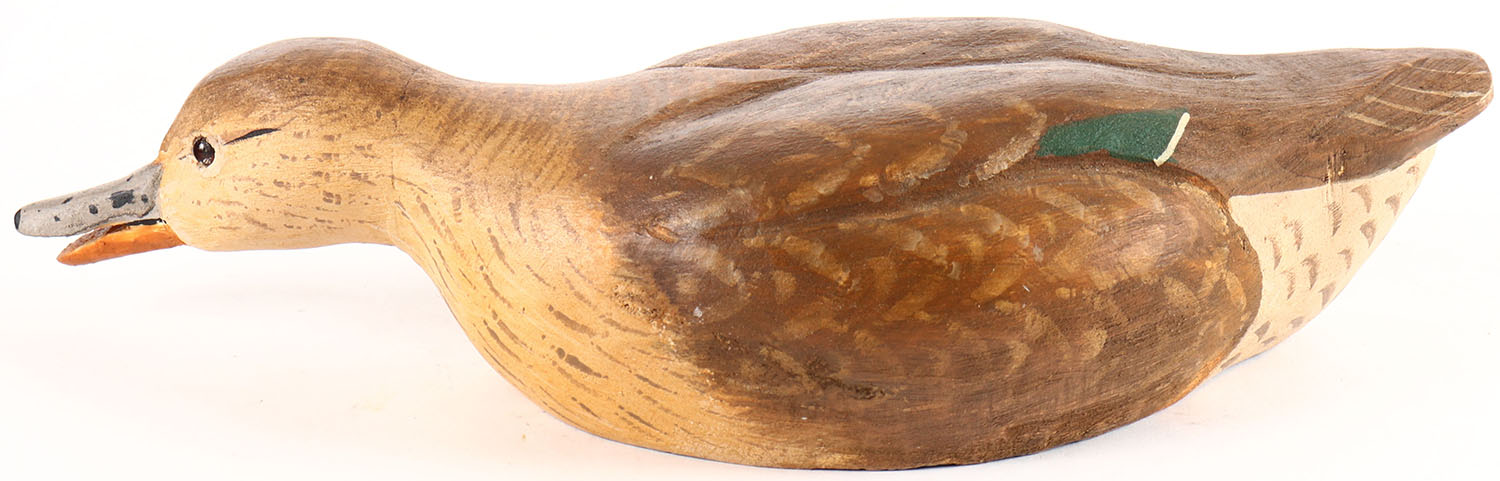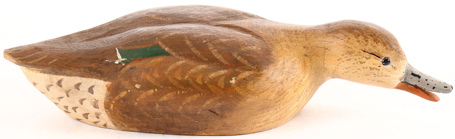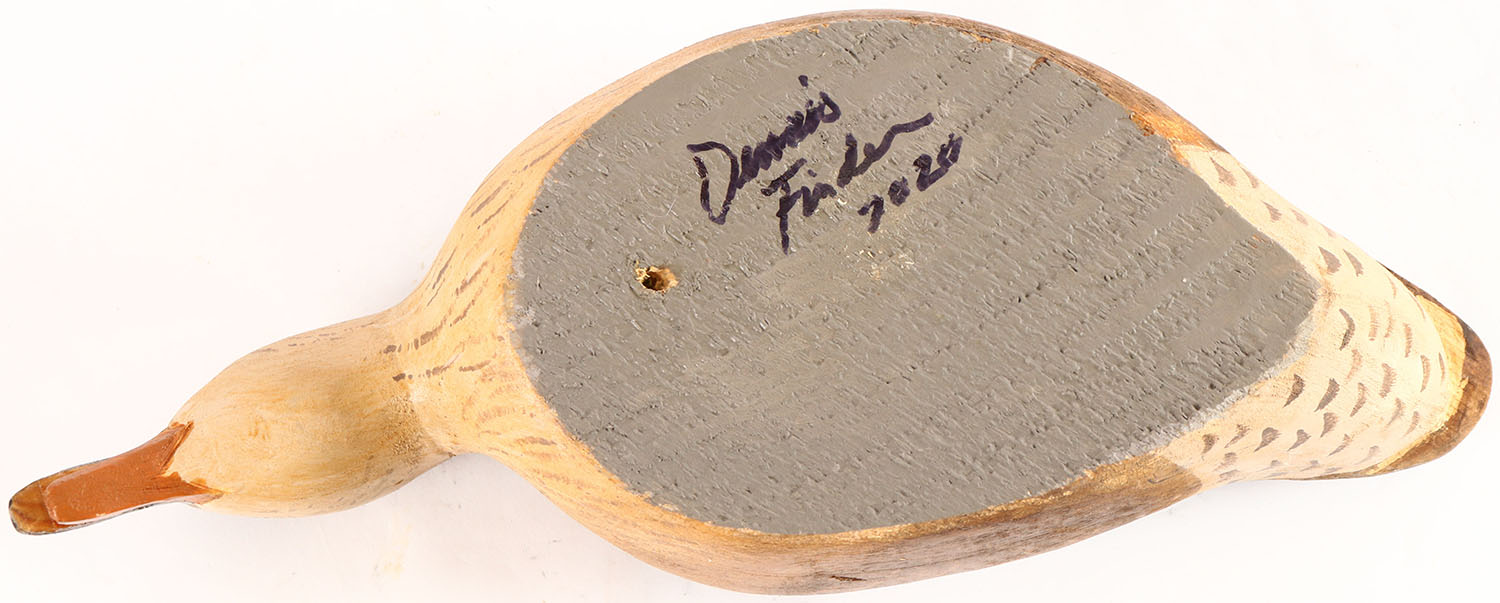 Swimming Green Winged Teal Hen by Dennis Finden, South St. Paul, MN, glass eyes, solid wood, original paint, structurally excellent, signed by DENNIS FINDEN on bottom. Grade: Excellent + - Value: 20 to 40