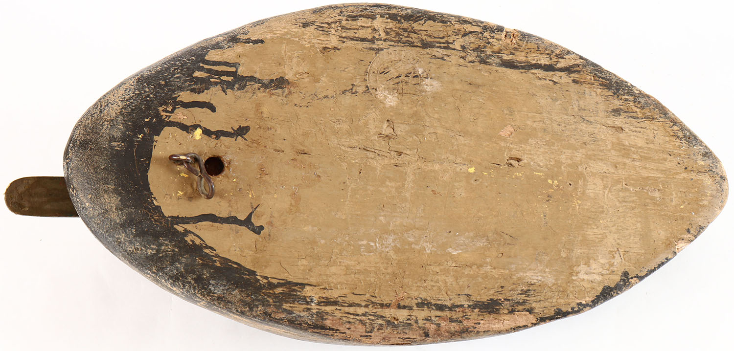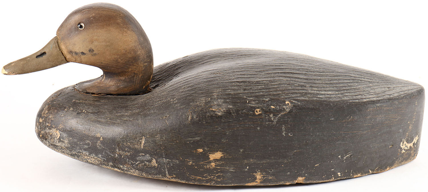 Black Duck by Wildfowler, Atlantic model, glass eyes, solid wood, original paint with some wear, has age cracks on back, chip above eye. Grade: Very Good ++ - Value: 40 to 80