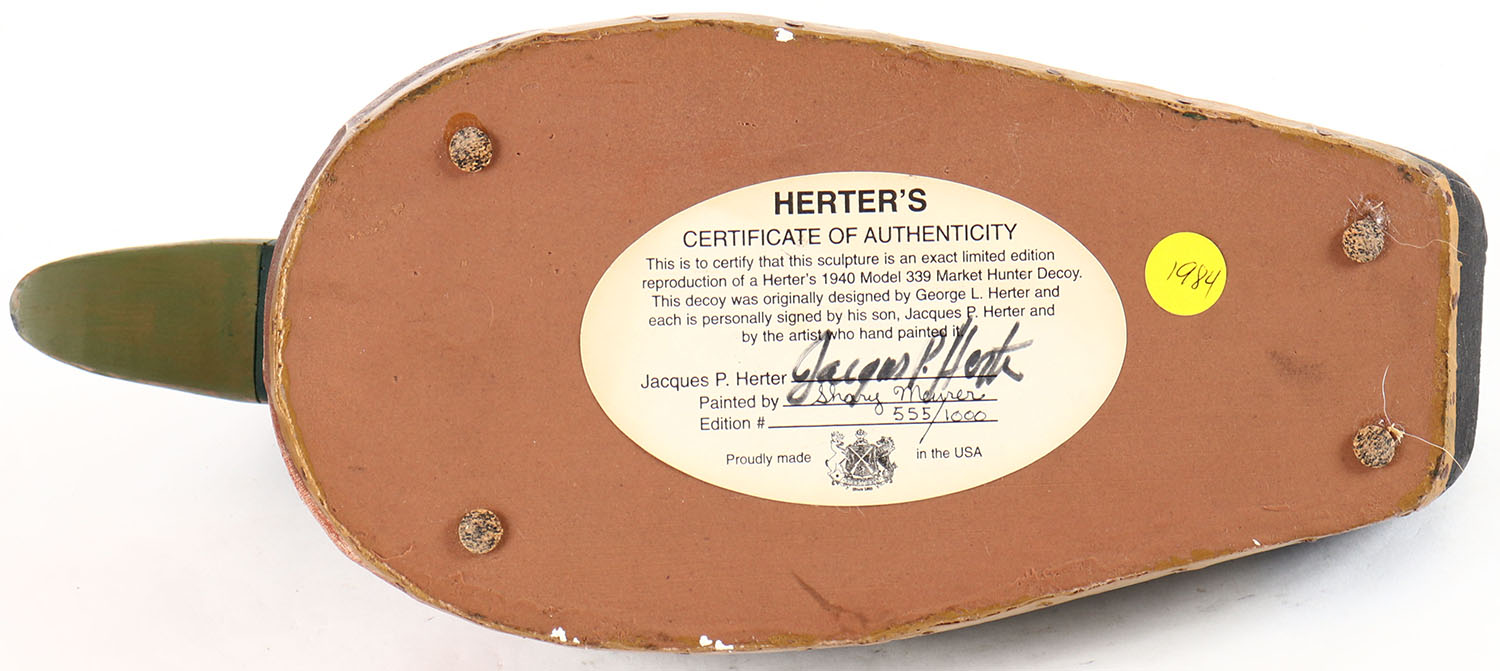 Mallard Drake by Herter's Decoy Co., Waseca, MN, reproduction series, glass eyes, hollow wood, original paint, structurally excellent. Grade: Very Good + - Value: 20 to 40