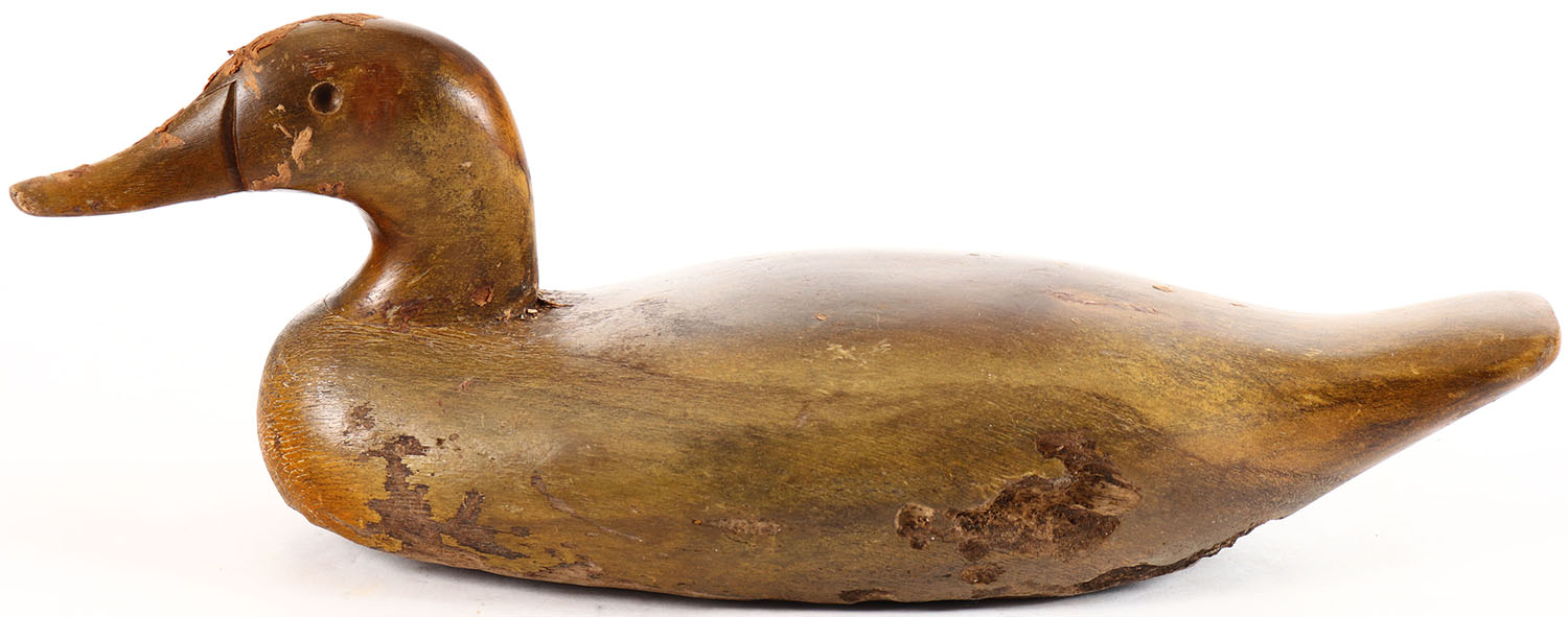 Mallard Hen by unknown maker, no eyes, solid wood, original paint, has wear to body. Grade: Very Good - Value: 20 to 40