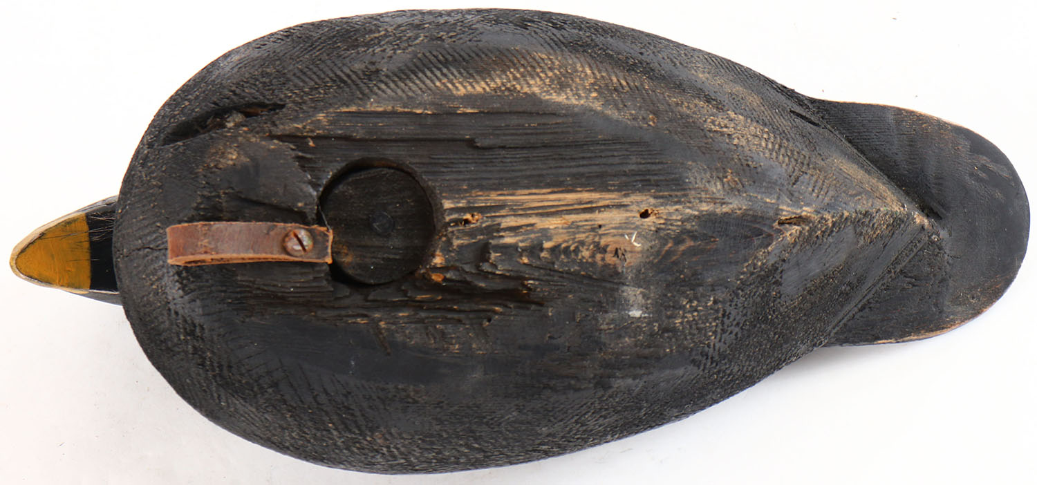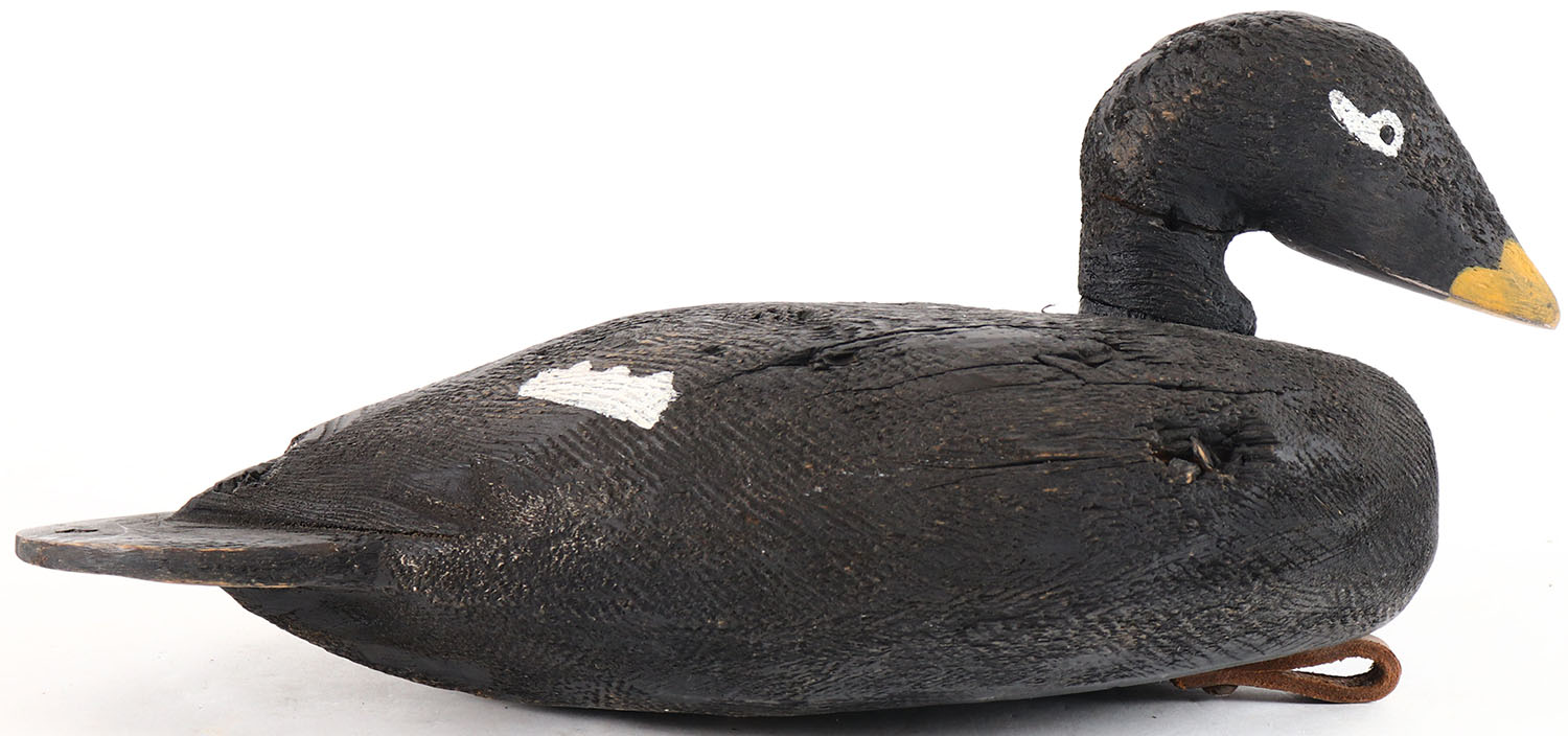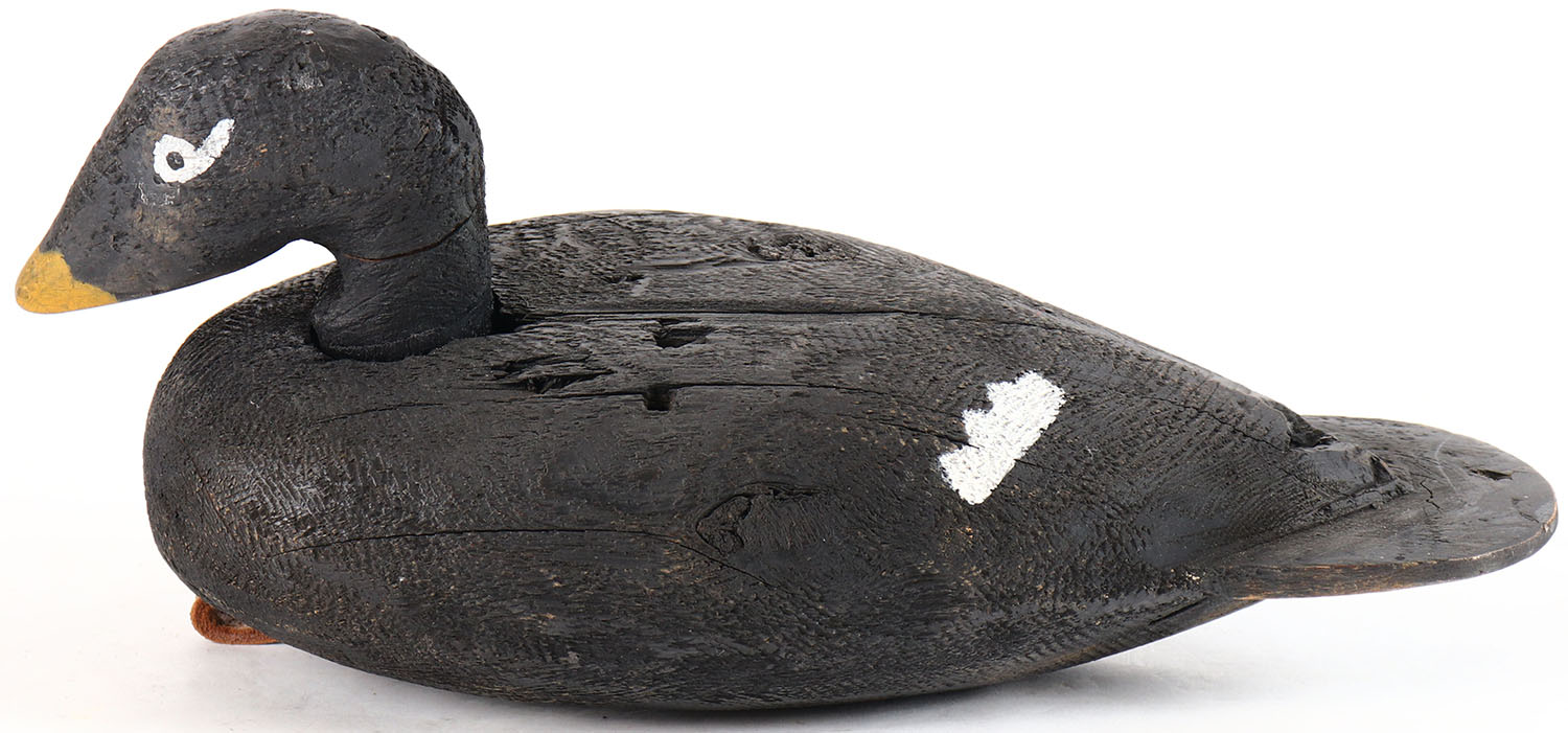 Scoter by unknown maker, painted eyes, solid wood, original paint, has age cracks on body. Grade: Very Good + - Value: 20 to 40