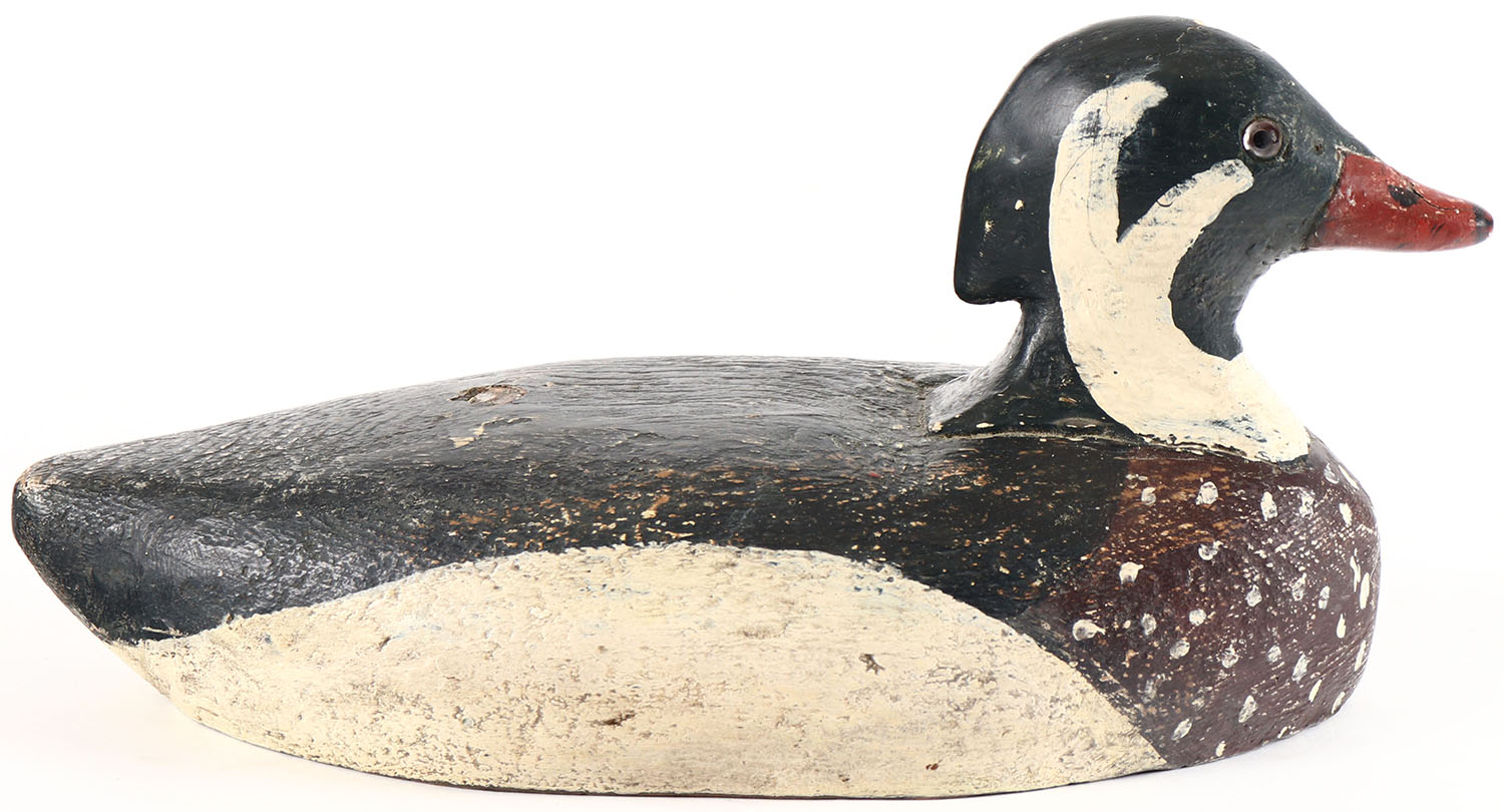 Woodduck Drake by unknown maker, glass eyes, solid wood, original paint, has chips on head and body. Grade: Very Good + - Value: 10 to 30