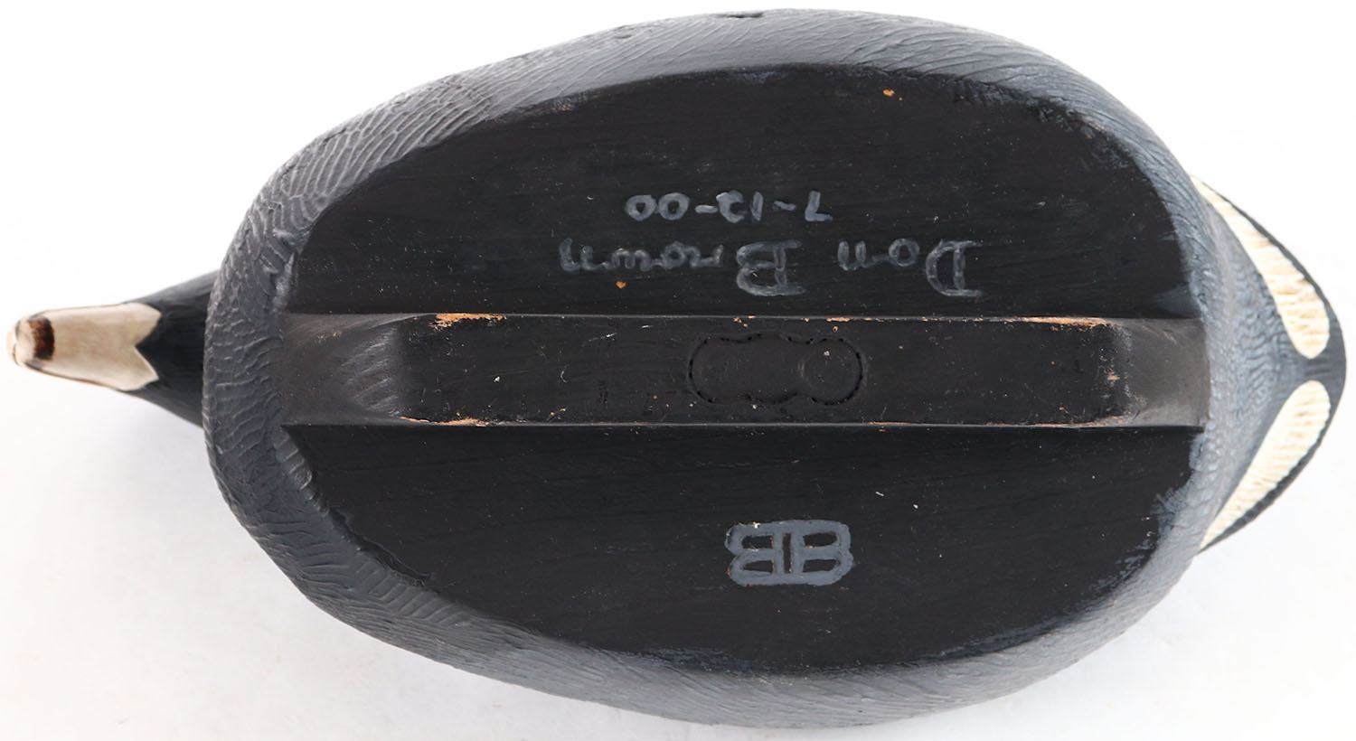Coot by Don Brown, Springfield, MO , glass eyes, solid wood, original paint, structurally excellent, signed by DON BROWN on bottom. Grade: Excellent + - Value: 30 to 60