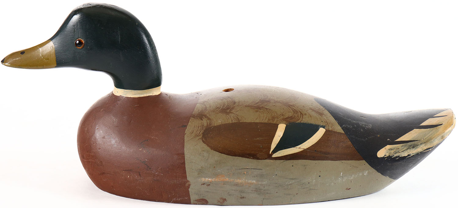 Mallard Drake by PADCO, Pascagoula, MS, glass eyes, solid wood, original paint, hole drilled on top of body. Grade: Excellent - Value: 10 to 30